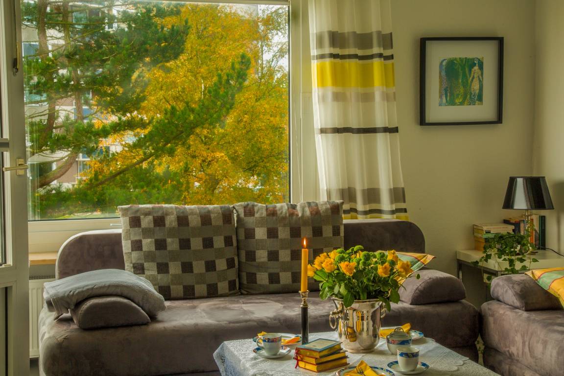 Der Wohnbereich ist mit einer gemütlichen Sitzecke (Schlaffunktion), einer offenen, kleinen Küchenzeile sowie mit einem Essplatz für 4 Personen versehen. Von hier aus gelangen Sie auf den möblierten Seeblick-Balkon. Die kleine Küchenzeile ist u.a. mit einem 4-er Induktionsplattenherd, einer Mikrowelle, einer kleinen Geschirrspülmaschine, einer Kaffee- plus einer Nespresso-Maschine, einem Toaster, Eier- und Wasserkocher ausgestattet. Ein 42" Sony Flachbild-TV mit BluRay-Player (auch DVD) sowie ein Internet- Radio mit WLAN-Anbindung etc. sind vorhanden. Das Fernsehangebot beinhaltet Magenta TV mit den Modulen Mega Sport Fußball Bundesliga/Champions League, Sport und HD, dazu über Apple-TV Zugang zu WOW Sport Paket, Amazon Prime und Netflix sowie Apple Music, Apple TV. Das separate Schlafzimmer ist mit einem Doppelbett mit Taschenfederkernmatrazen versehen. Das Bad verfügt über eine Badewanne (mit Duschmöglichkeit), Waschbecken und WC. Das Schlafzimmer ist verdunkelbar.