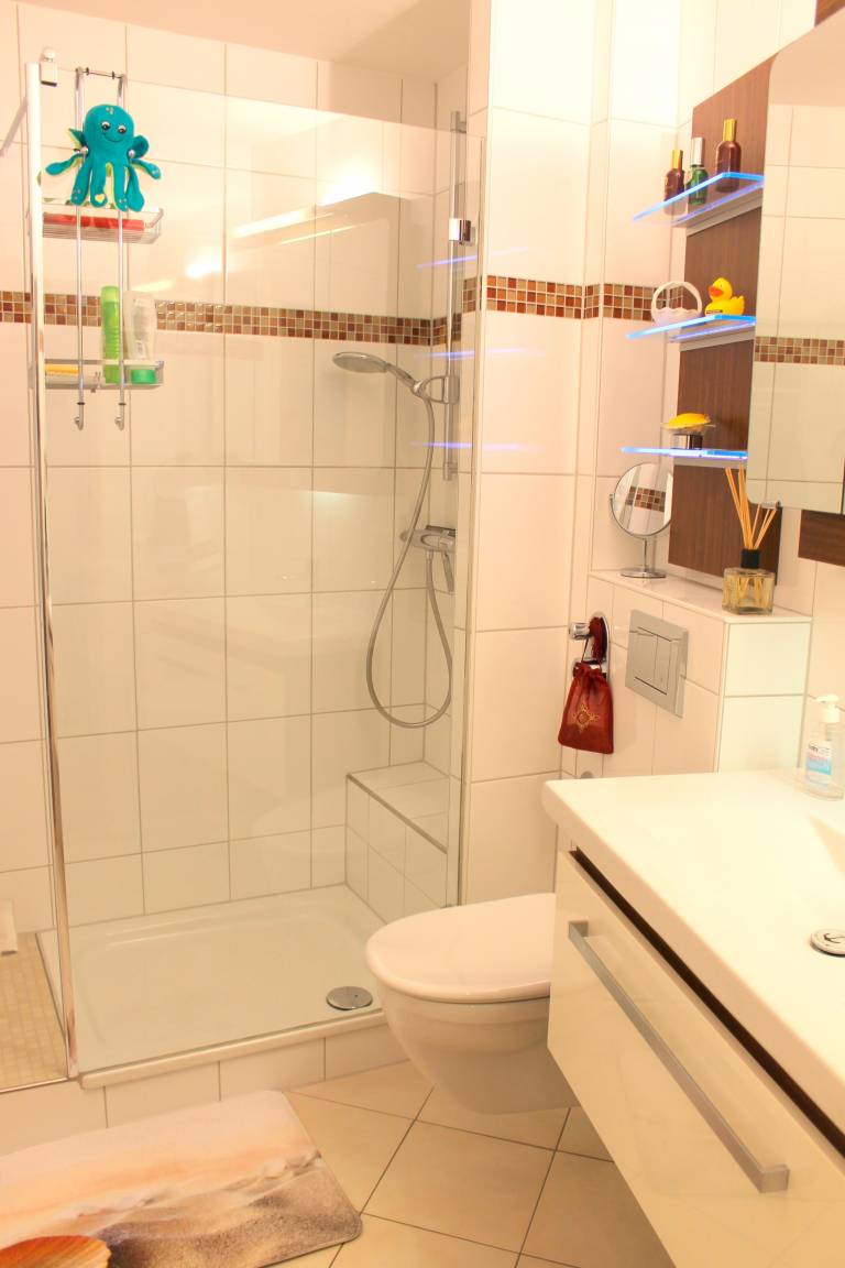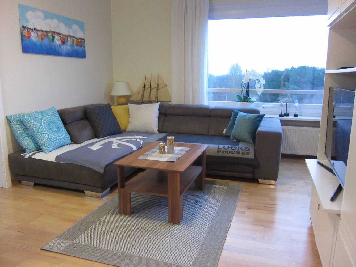 Die "Meeresperle" bietet Platz für max. vier Personen (zwei Erwachsene und zwei Kinder) und liegt in der 6. Etage - ein Fahrstuhl ist bis zur 5. Etage vorhanden. Die Wohnfläche der ca. 54 m² großen Ferienunterkunft verteilt sich auf ein helles Wohn-/ Esszimmer mit Seeblick, zwei separate Schlafzimmer sowie die kleine Küche und das Badezimmer. Das Wohnzimmer ist mit einer gemütlichen Sitzecke sowie einem Essplatz versehen, von hier aus haben Sie Zugang zur Ost-Loggia, diese lädt zum gemütlichen Verweilen ein. Die neue und moderne Einbauküche ist u.a. mit Spülmaschine, Mikrowelle mit Backfunktion, 4 Plattenherd, Kaffeemaschine, Kaffeeautomat und weiteren Küchengeräten ausgestattet. Ein Schlafzimmer geht ebenfalls vom Wohnzimmer ab und ist mit einer hochwertigen Doppelschlafcouch (mit Lattenrost, 2 m x1,60 m breit) sowie einem Regal und einer großen Kleiderschrankwand versehen. Das andere Schlafzimmer verfügt über bequeme Boxspringbetten (je 0,90m x 2,00m) und eine große Kleiderschrankwand ist ebenfalls vorhanden. Das Badezimmer ist mit einer großen offenen Dusche versehen (eine Möglichkeit zum Sitzen ist vorhanden), eine Handtuchheizung befindet sich hier ebenfalls.