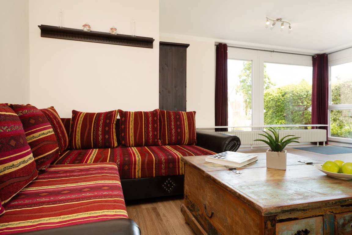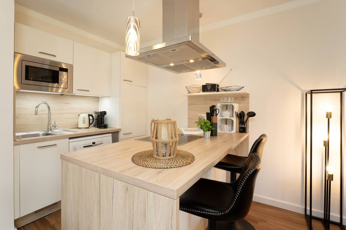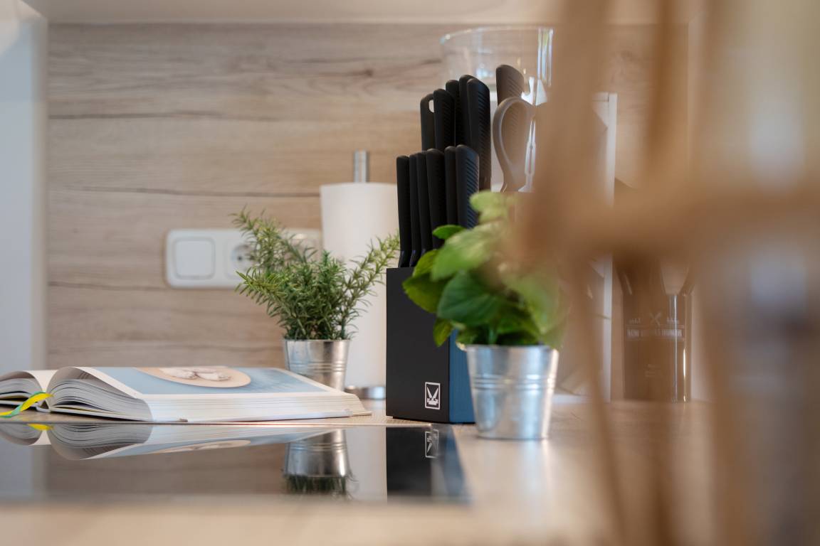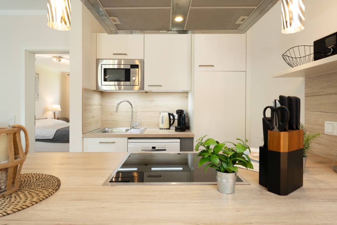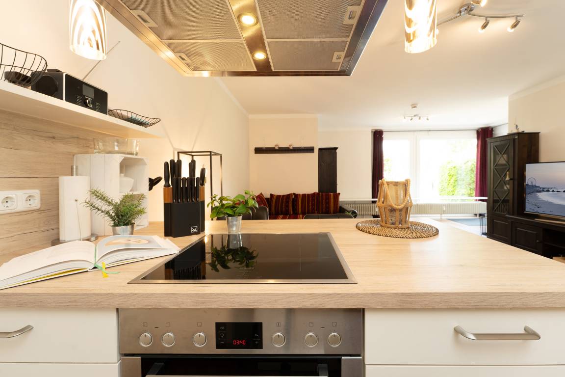 Die offene Küche ist vollständig ausgestattet und lässt keine Wünsche offen: Induktionsherd, Backofen, Kühlschrank mit Gefrierfach, Spülmaschine, Wasserkocher, Kaffeemaschine, Senseo-Maschine, Toaster, Mixer und ein Eierkocher stehen für die Zubereitung Ihrer Lieblingsgerichte bereit. Der angrenzende Essbereich bietet Platz für vier Personen.