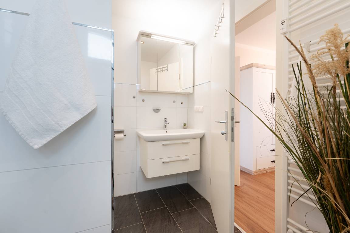 Das Schlafzimmer überzeugt mit einem komfortablen Doppelbett. Zwei weitere Schlafmöglichkeiten befinden sich im Wohnbereich. Das moderne Badezimmer, das nur über das Schlafzimmer zu erreichen ist, verfügt über eine bodengleiche Dusche mit Haltegriff, WC, Waschbecken, Haartrockner und Handtuchheizkörper.