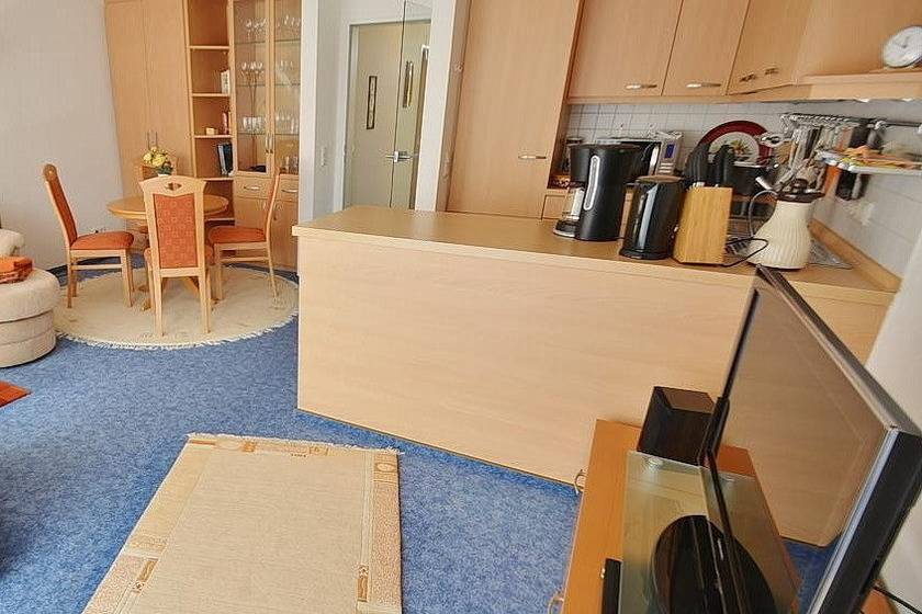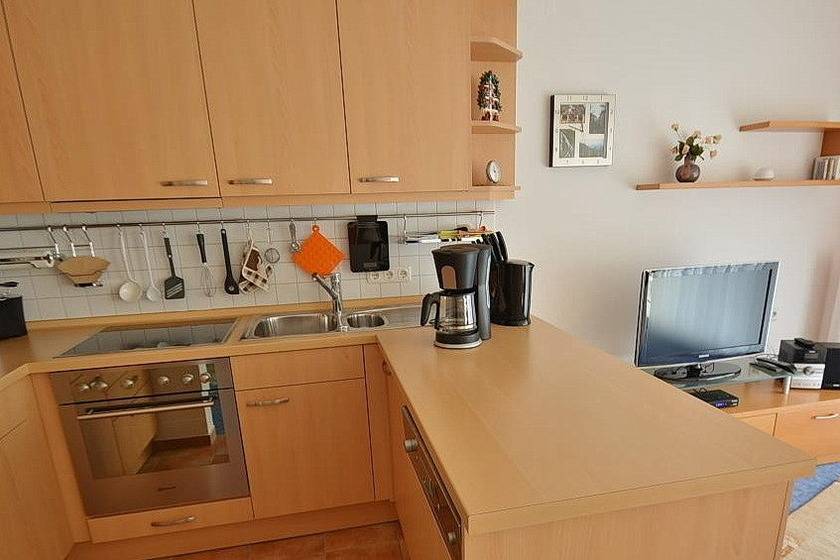 Komplett ausgestattete zum Wohnzimmer offene Küchenzeile mit 4 Platten Cerankochfeld, Backofen, Spülmaschine und Kühlschrank mit kleinem Gefrierfach. Des Weiteren stehen eine Mikrowelle, ein Wasserkocher, eine Kaffeemaschine und ein Toaster zur Verfügung.