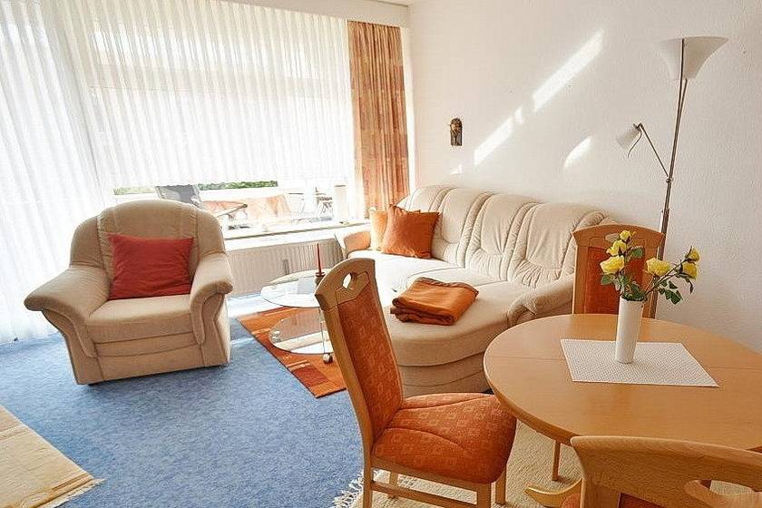 Das Wohnzimmer mit direktem Zugang zum Balkon ist mit einer gemütlichen Eckcouch mit Schlaffunktion (120x200cm), einem Sessel sowie einem Essplatz für 4 Personen ausgestattet. Zur Unterhaltung stehen ein Flachbildfernseher und eine kleine Stereoanlage zur Verfügung. Der Raum ist mit Teppichboden ausgelegt. Die Fenster lassen sich durch Vorhänge verdunkeln.