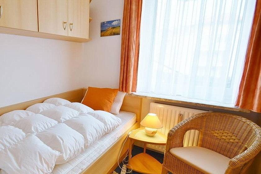 Das Schlafzimmer ist ausgestattet mit 2 Einzelbetten (1x90x190cm und 1x90x200cm) ausgestattet. Der Raum ist mit Teppich ausgelegt, das Fenster lässt sich durch einen Vorhang verdunkeln.