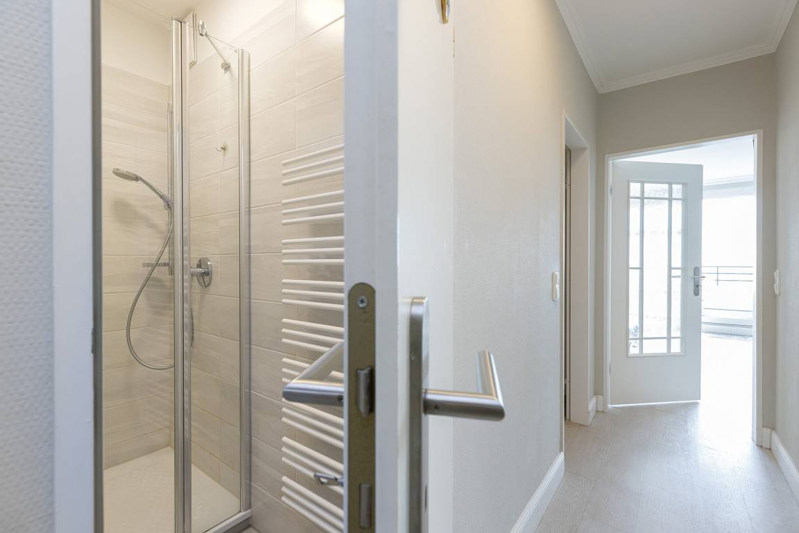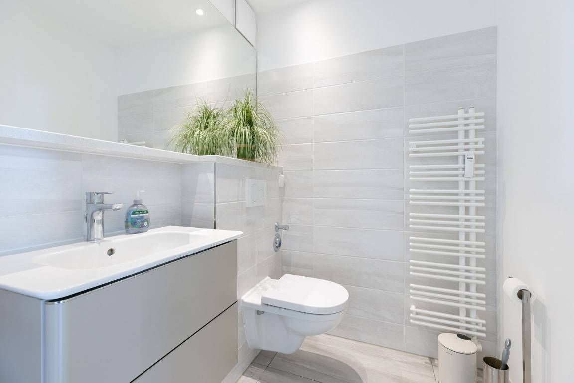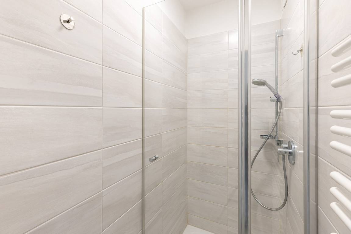 Gepflegtes, gefliestes Bad mit Dusche, WC und Waschbecken.