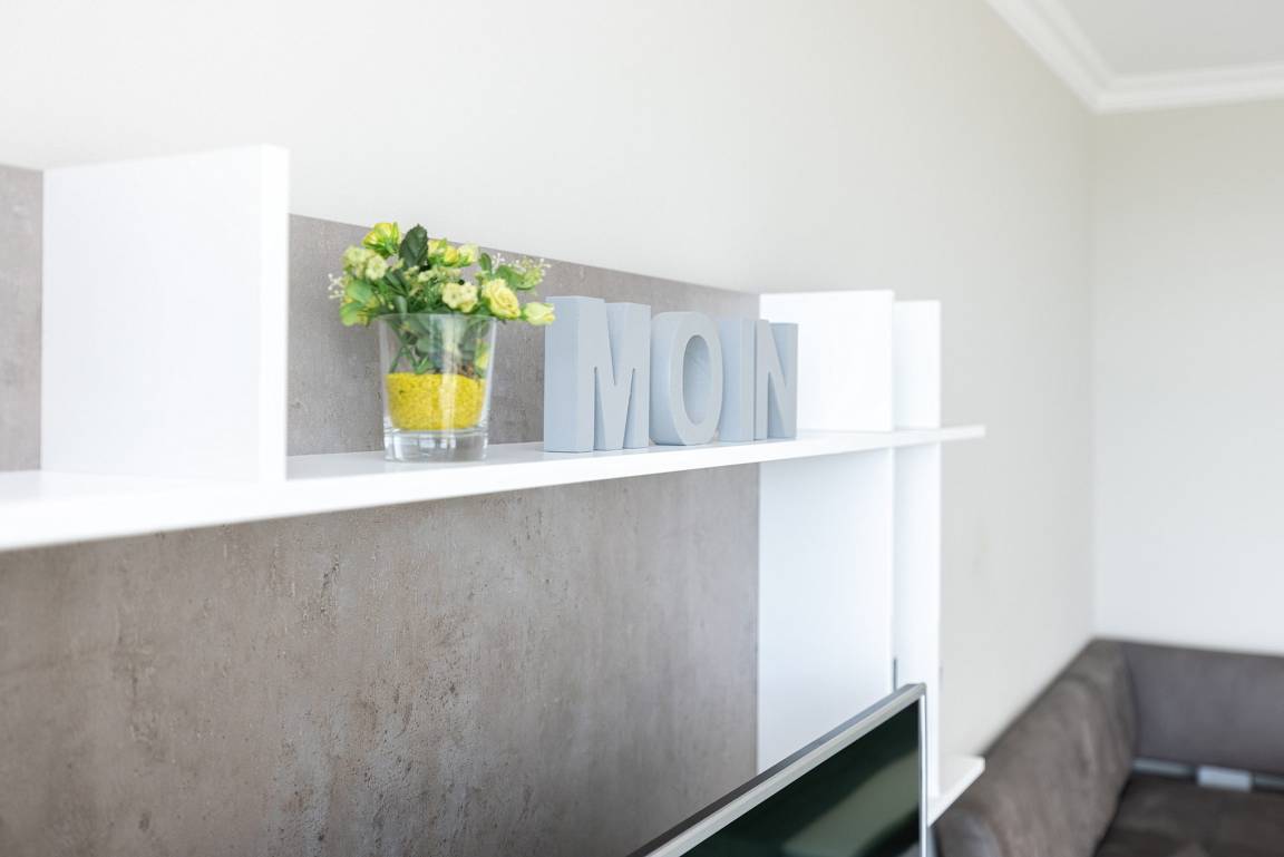 Das helle, freundliche und großzügige Wohn- und Esszimmer mit direktem Zugang zum Balkon mit Markise ist mit einer Eckcouch, einem Couchtisch und einem Essplatz für 4 Personen ausgestattet. Zur Unterhaltung steht ein Flachbildschirm zur Verfügung. Das Wohn- und Esszimmer ist mit Laminat ausgelegt.