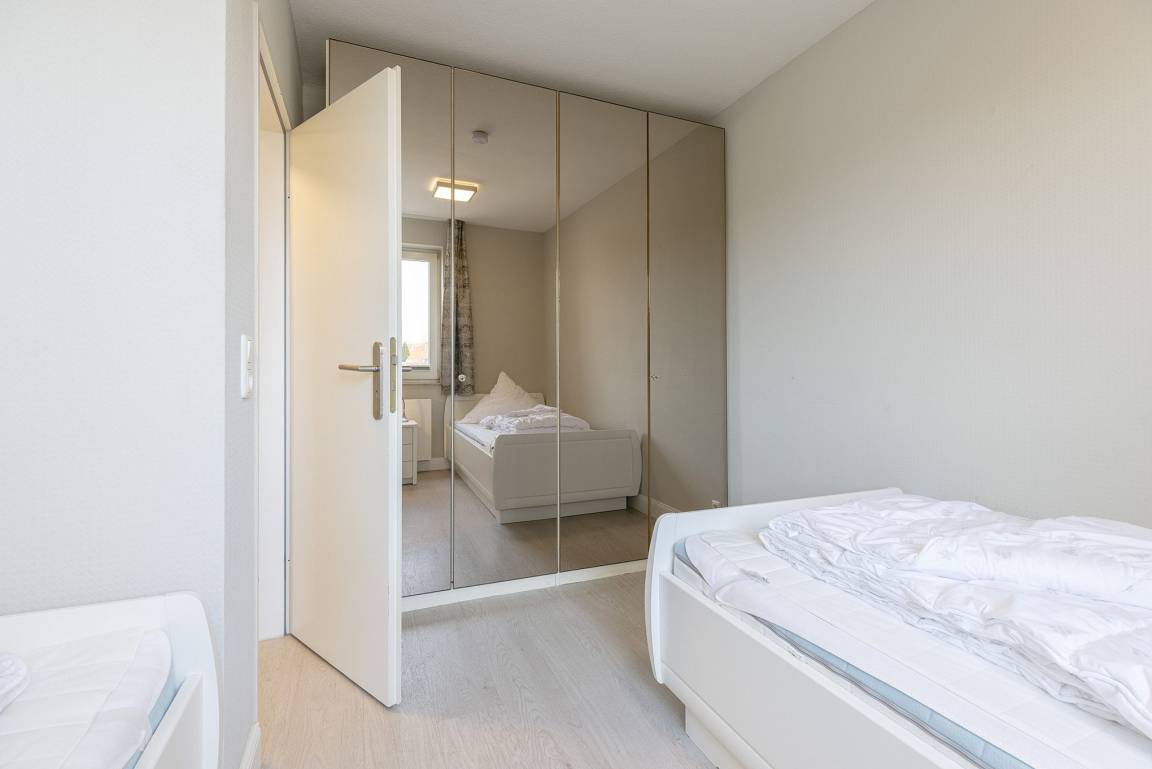 Das separate Kinderzimmer ist mit 2 Einzelbetten, einem großen Kleiderschrank sowie einem Nachttisch ausgestattet. Das Fenster lässt sich durch einen Vorhang und einem Plissee etwas verdunkeln. Das Kinderzimmer ist mit Laminat ausgelegt.