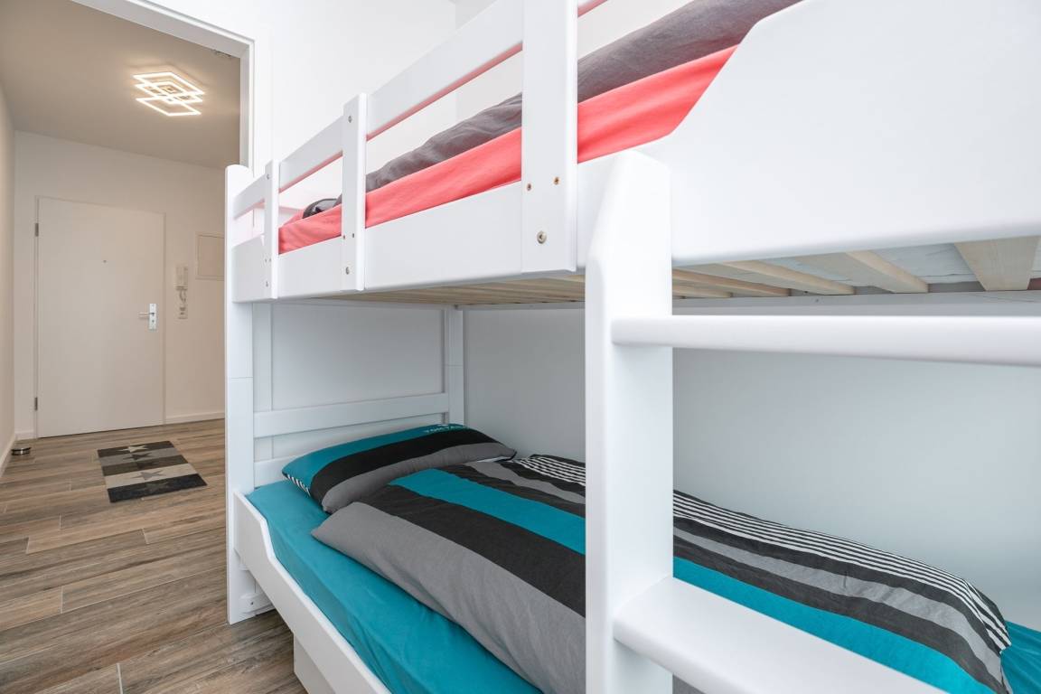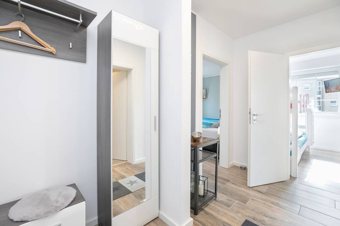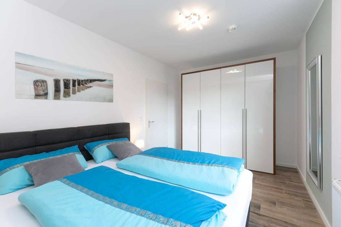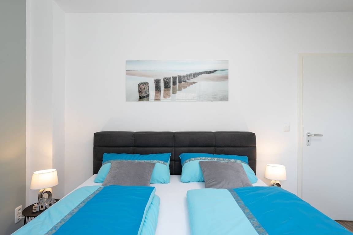Im ersten separaten Schlafzimmer befindet sich ein Boxspring-Doppelbett (2x 90x200 cm) sowie ein Kleiderschrank. Das zweite separate Schlafzimmer verfügt über ein Etagenbett (je 90x200 cm). Die Schlafräume können mit elektrischen Rollläden vollständig verdunkelt werden. Durch die große Fensterfront ist die Wohnung jederzeit hell und lichtdurchflutet. Vom Wohnbereich aus gelangen Sie auf den möblierten Balkon, welcher zum Verweilen in der Sonne einlädt. Das Wohnzimmer ist mit Thermoplissees ausgestattet, sodass es im Sommer nicht zu heiß wird. Der Flat-TV mit einer Bilddiagonale von 139 cm vertreibt Ihnen die Zeit an Regentagen. Die moderne, voll ausgestattete Küche hat für Sie nur das Beste zu bieten: Edles Besteck sowie Töpfe und eine Kaffeemaschine von WMF. Auch das Geschirr und die verschiedenen Wein- und Sektgläser sind hochwertig und wurden sehr sorgfältig für Sie ausgesucht. In der offenen Küche befindet sich eine große Kühl- Gefrierkombination, eine Mikrowelle sowie ein Induktionsherd - Selbstverständlich gibt es auch einen Geschirrspüler, der Ihnen im Urlaub viel Arbeit abnimmt. Das Badezimmer erstrahlt in einem völlig neuen Glanz: Mit toller, bodentiefer Wellness-Dusche sowie ansprechendem Design. Der Waschtisch ist mit einem Bewegungsmelder ausgestattet, was für den nächtlichen Toilettenbesuch sehr angenehm ist. Der WLAN-Anschluss ist für Sie inklusive.