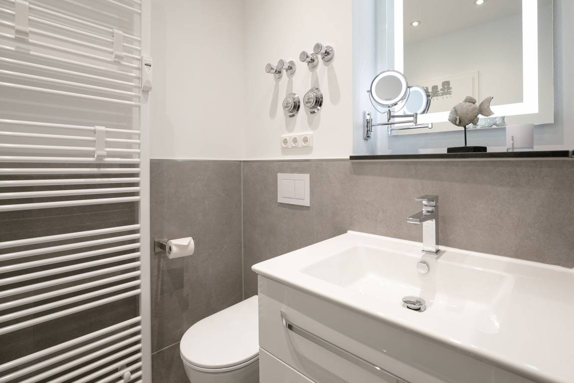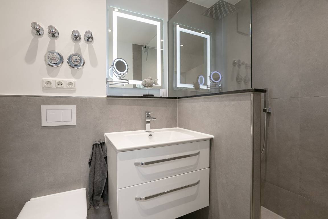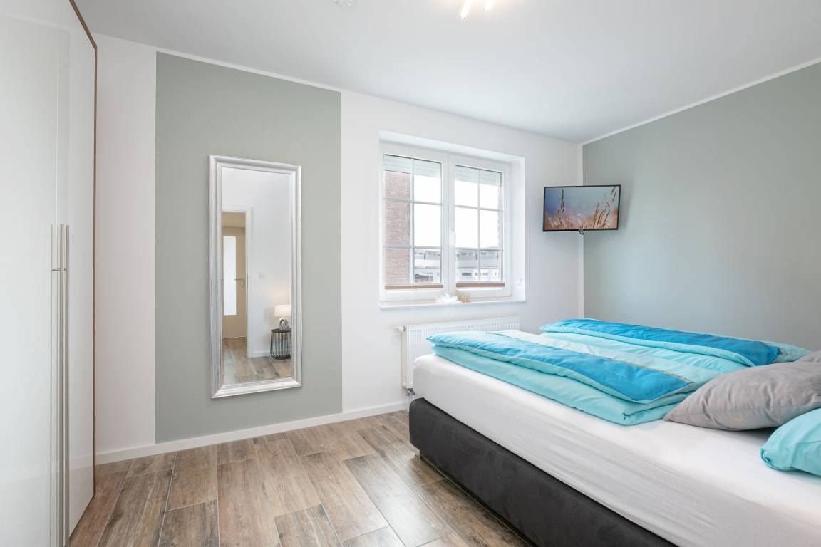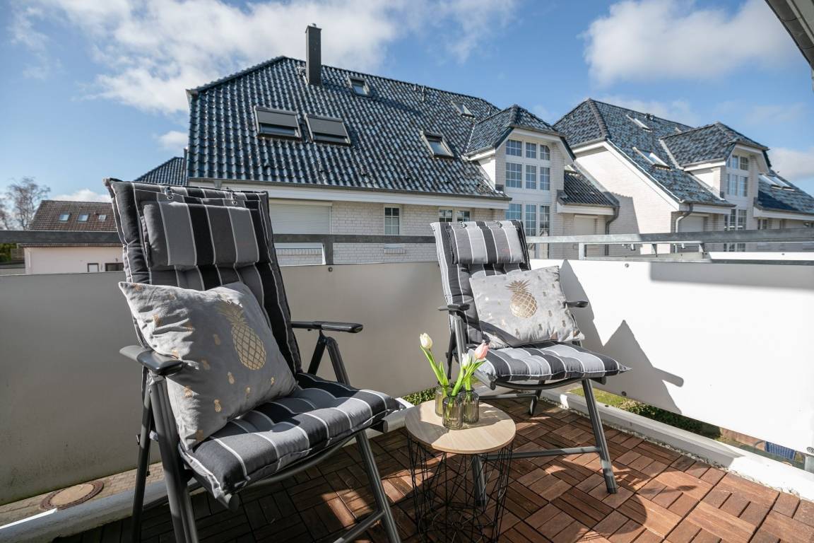 Im ersten separaten Schlafzimmer befindet sich ein Boxspring-Doppelbett (2x 90x200 cm) sowie ein Kleiderschrank. Das zweite separate Schlafzimmer verfügt über ein Etagenbett (je 90x200 cm). Die Schlafräume können mit elektrischen Rollläden vollständig verdunkelt werden. Durch die große Fensterfront ist die Wohnung jederzeit hell und lichtdurchflutet. Vom Wohnbereich aus gelangen Sie auf den möblierten Balkon, welcher zum Verweilen in der Sonne einlädt. Das Wohnzimmer ist mit Thermoplissees ausgestattet, sodass es im Sommer nicht zu heiß wird. Der Flat-TV mit einer Bilddiagonale von 139 cm vertreibt Ihnen die Zeit an Regentagen. Die moderne, voll ausgestattete Küche hat für Sie nur das Beste zu bieten: Edles Besteck sowie Töpfe und eine Kaffeemaschine von WMF. Auch das Geschirr und die verschiedenen Wein- und Sektgläser sind hochwertig und wurden sehr sorgfältig für Sie ausgesucht. In der offenen Küche befindet sich eine große Kühl- Gefrierkombination, eine Mikrowelle sowie ein Induktionsherd - Selbstverständlich gibt es auch einen Geschirrspüler, der Ihnen im Urlaub viel Arbeit abnimmt. Das Badezimmer erstrahlt in einem völlig neuen Glanz: Mit toller, bodentiefer Wellness-Dusche sowie ansprechendem Design. Der Waschtisch ist mit einem Bewegungsmelder ausgestattet, was für den nächtlichen Toilettenbesuch sehr angenehm ist. Der WLAN-Anschluss ist für Sie inklusive.