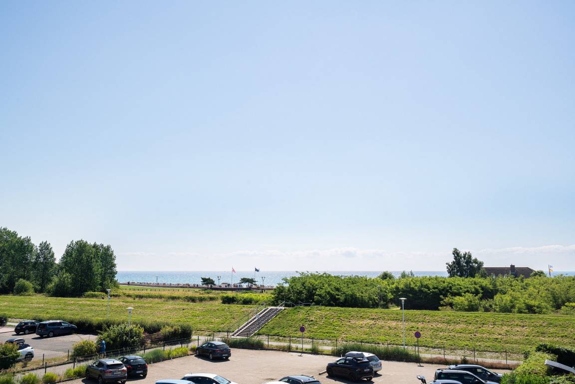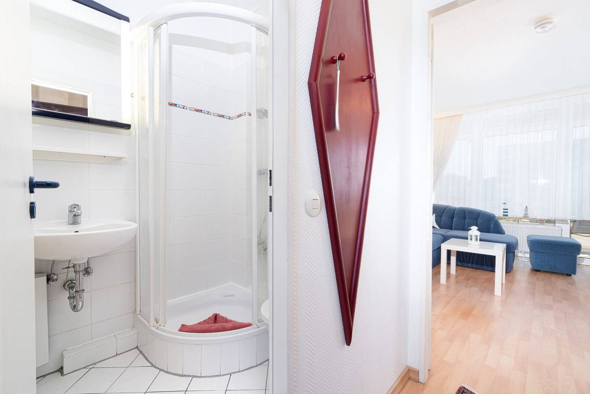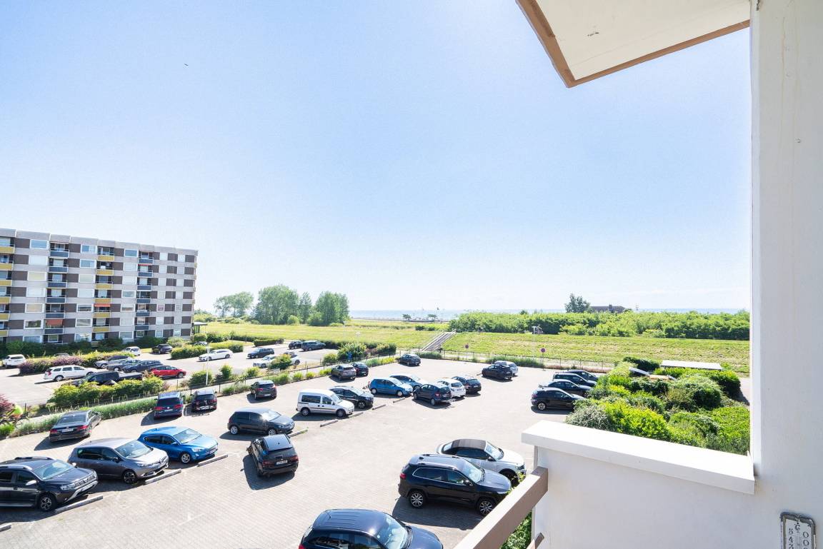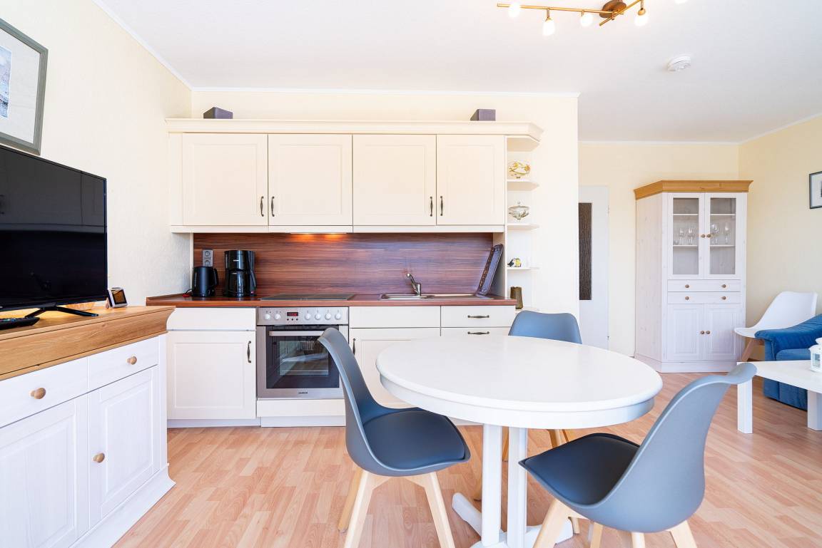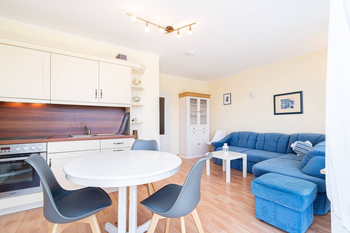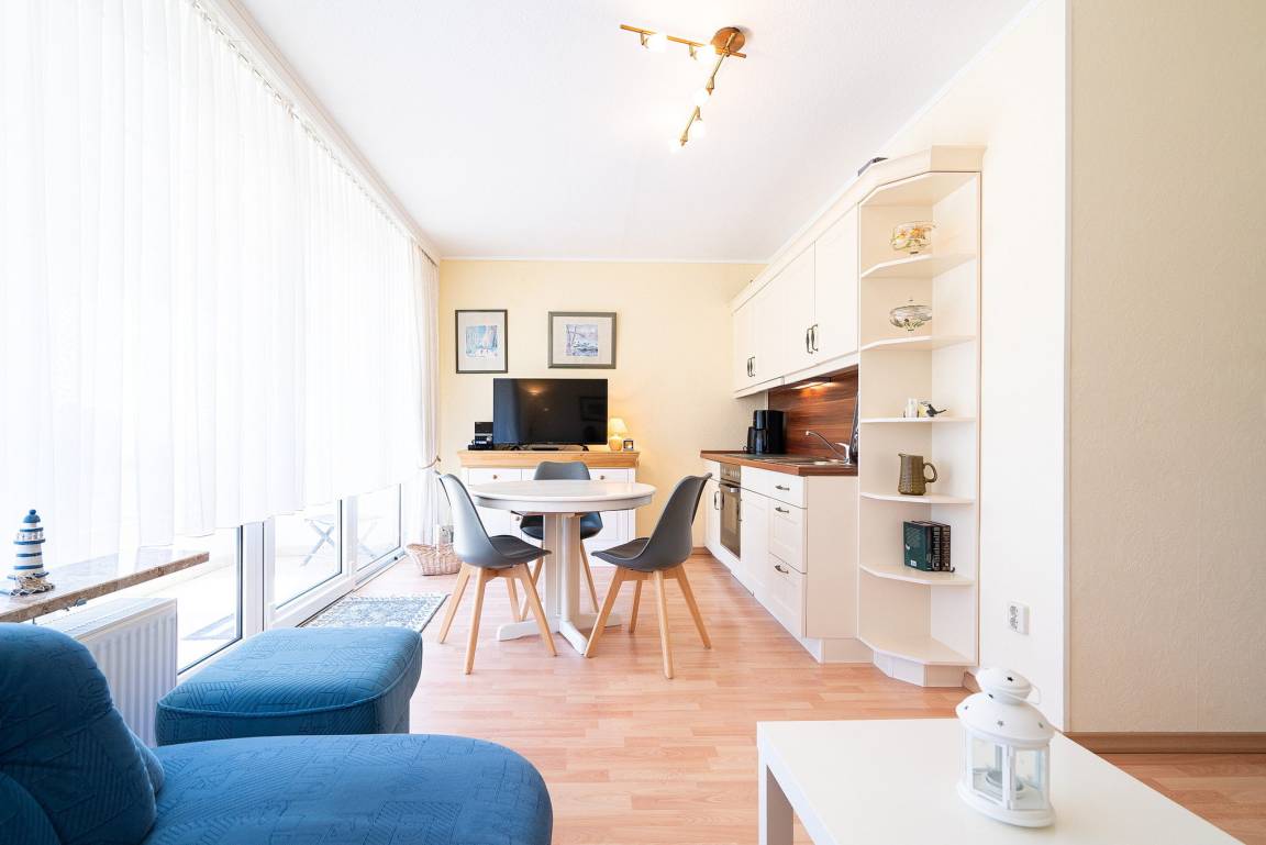 Gemütliches Wohn- und Esszimmer mit direktem Zugang zum sonnigen Balkon mit Blick auf den Deich und seitlichem Seeblick. Das Wohn- und Esszimmer ist mit einem Essplatz für 3 Personen, einem Wohnzimmerschrank, einer Schlafcouch und einem Couchtisch ausgestattet. Des Weiteren stehen ein Fernseher und eine kleine Hifi-Anlage zur Verfügung.