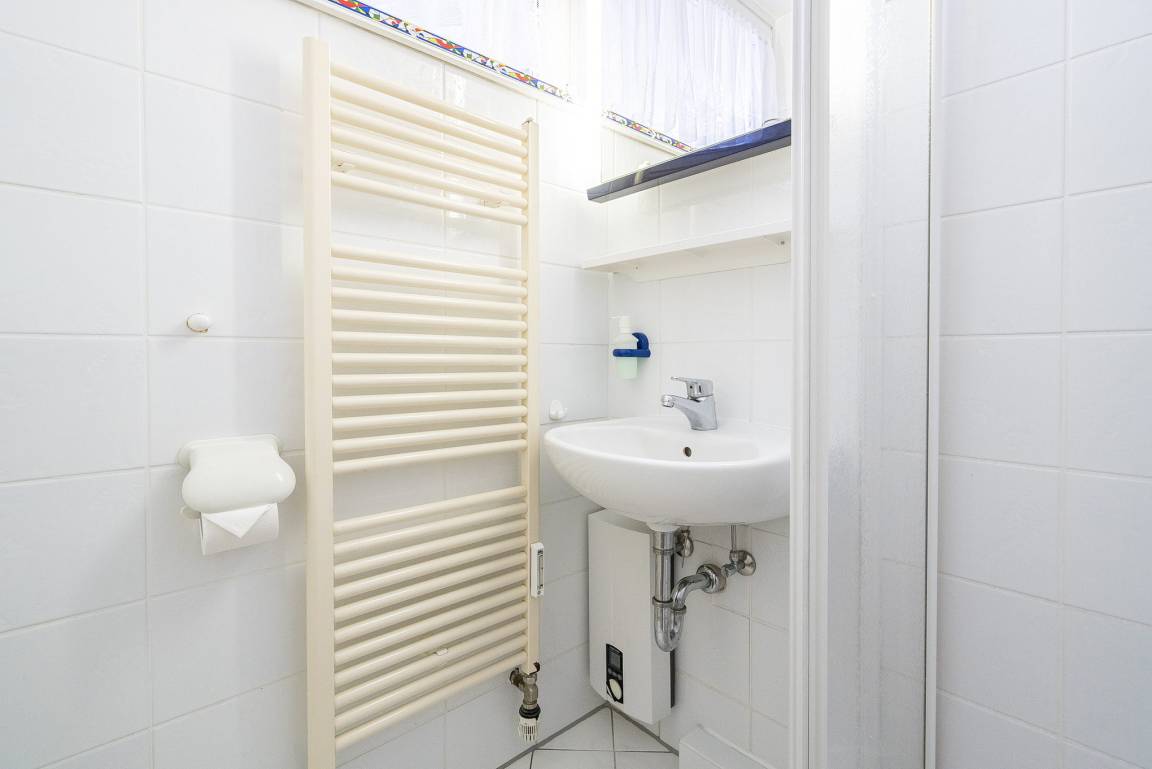 Kleines gefliestes Bad mit Dusche, WC und Waschbecken.