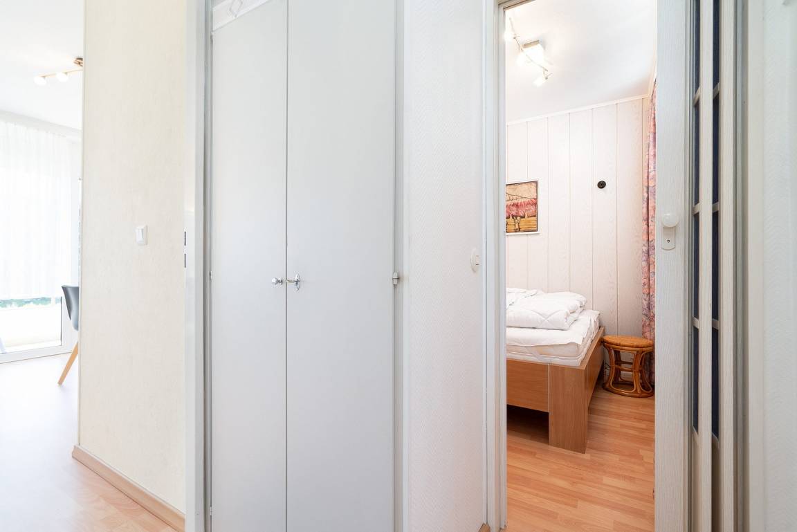 Schlafzimmer mit Doppelbett ( nur von einer Seite begehbar) und einem Kleiderschrank. Das Fenster zum Laubengang lässt sich durch einen Vorhang leicht verdunkeln.