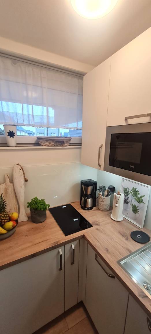 Im Frühjahr 2024 haben wir die Einbauküche erneuert. Hier finden Sie einen Geschirrspüler, eine Mikrowelle, ein 2-Zonen-Induktionsfeld, sowie einen Kühlschrank mit Gefrierfach. Selbstverständlich auch Kaffeemaschine, Toaster und andere nützliche kleine Küchenhelfer.