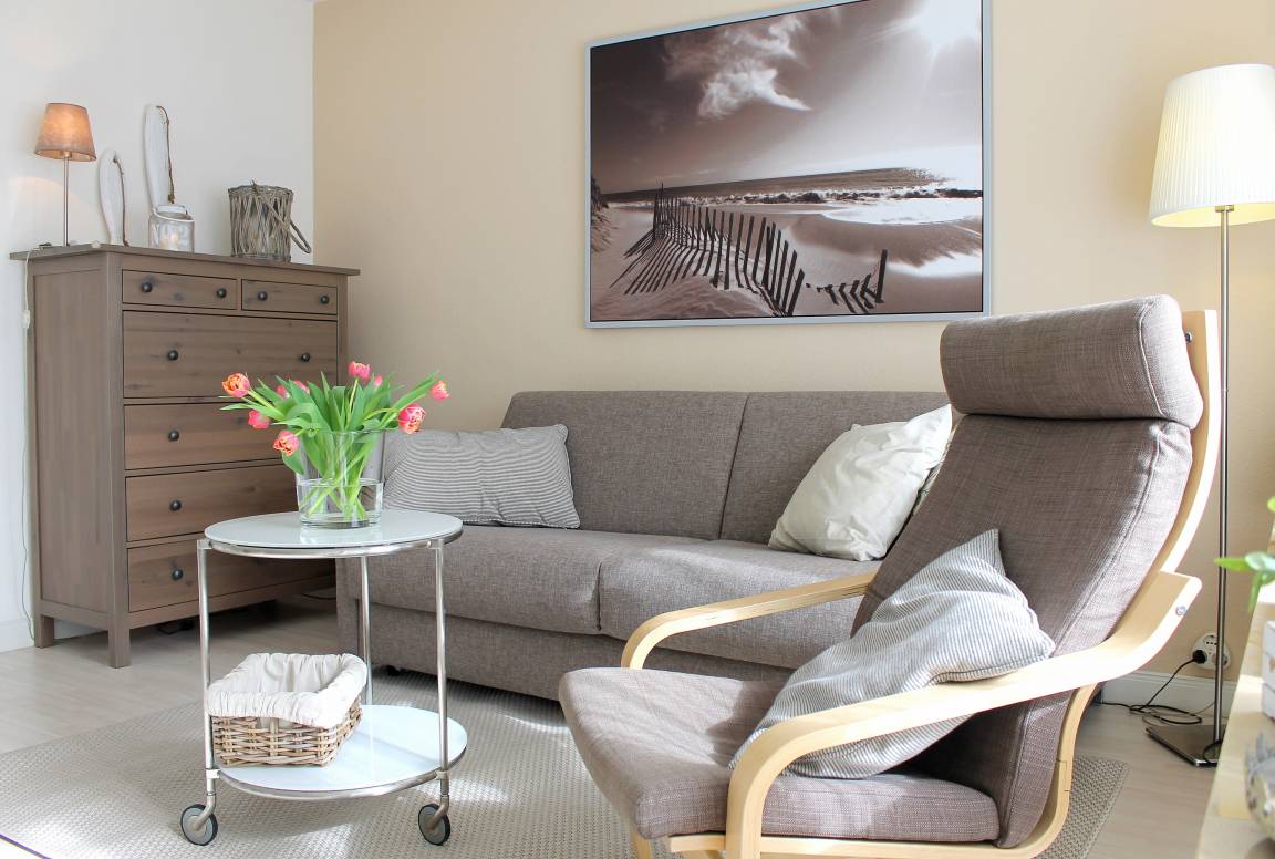 Im kombinierten Wohn/ Esszimmer befinden sich eine Schlafcouch (Breite 1,50 m), zwei Sessel, Esstisch mit 4 Stühlen, ein großer LCD-Fernseher, SAT-TV, DVD-Player und eine Stereoanlage. Der Wohnbereich lädt zu gemütlichen Stunden ein. Eine Sammlung an Büchern und Spielen steht Ihnen zur Verfügung.