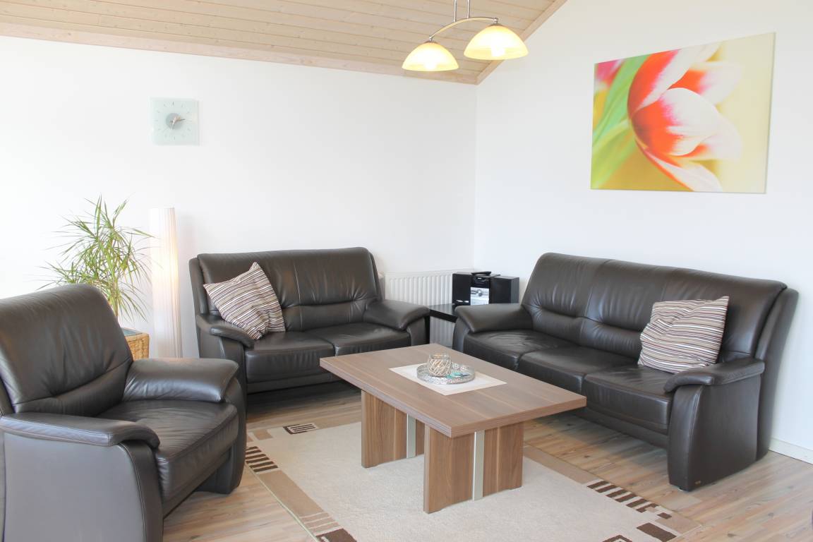 Die Wohnfläche des ca. 83 m² großen Ferienhauses verteilt sich auf ein helles Wohnzimmer mit offener Küche, drei separate Schlafzimmer, ein Badezimmer mit einer Sauna sowie ein zweites Badezimmer. Der große Wohnraum ist mit einer Sofaecke, einem Flachbild-TV (SAT) sowie einem Kaminofen ausgestattet, ebenso befindet sich hier eine offene Küchenzeile sowie ein Essplatz. Eine Sammlung an Büchern steht für Sie bereit. Der gemütliche offene Wohnbereich lädt im Sommer wie im Winter zu entspannten Stunden ein. Von hier aus haben Sie Zugang zur möblierten und überdachten Süd-West-Terrasse und zum großen Garten - zur gemeinschaftlichen Benutzung mit dem Nachbarhaus steht ein geschützter Grillplatz mit Grill zur Verfügung. Der große Garten ist für alle Gäste zugänglich und bietet für Groß und Klein, für Jung und Alt viel Platz zum Toben oder zum Entspannen. Die offene Küche ist u.a. mit einem 4er Ceranfeld, einem Backofen, einer Geschirrspüler und weiteren Kleingeräten ausgestattet. Alle drei Schlafzimmer verfügen über ein Doppelbett ( 1,80 x 2,00 m - getrennte Matratzen) sowie einen Kleiderschrank. Die Schlafzimmer sind mit Verdunkelungsvorhängen ausgestattet. Das Tageslicht-Badezimmer ist mit Dusche/WC, einer Handtuchheizung sowie einer eingebauten Sauna versehen. Ein zweites Tageslicht-Badezimmer verfügt ebenfalls über Dusche/WC.