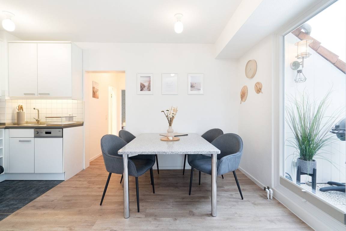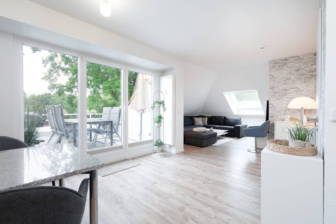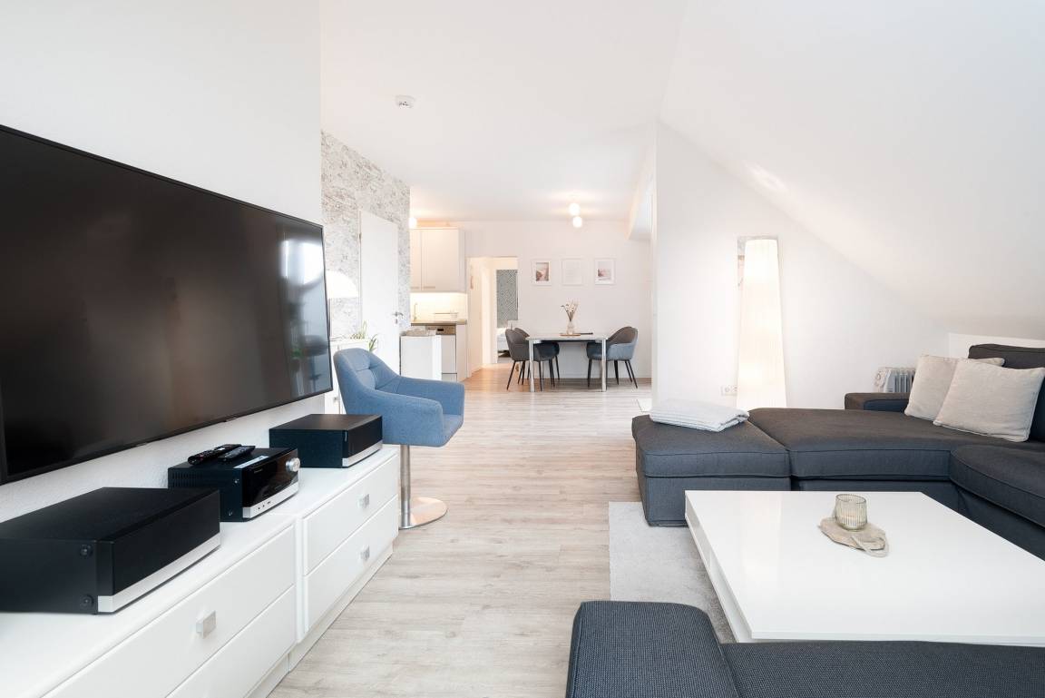 Großzügiger lichtdurchfluteter Wohn-Essbereich mit direktem Zugang zu einer von 2 Loggias. Der Wohnraum ist ausgestattet mit einem 5er Ecksofa mit zusätzlichem Hocker, und einem Esstisch mit Platz für 4 Personen. Zur Unterhaltung stehen ein 55 Zoll Smart-TV und eine Hifi-Anlage mit Bluetooth und MP3 zur Verfügung. Der Boden ist mit Designer Planken ausgelegt.