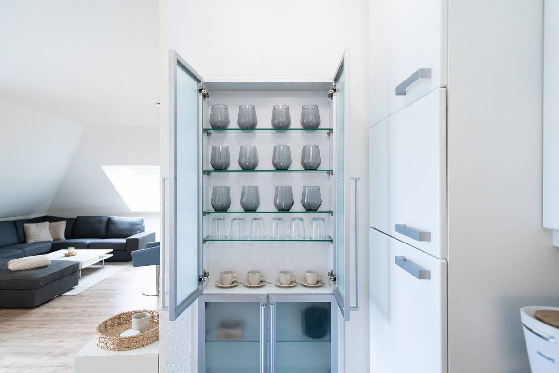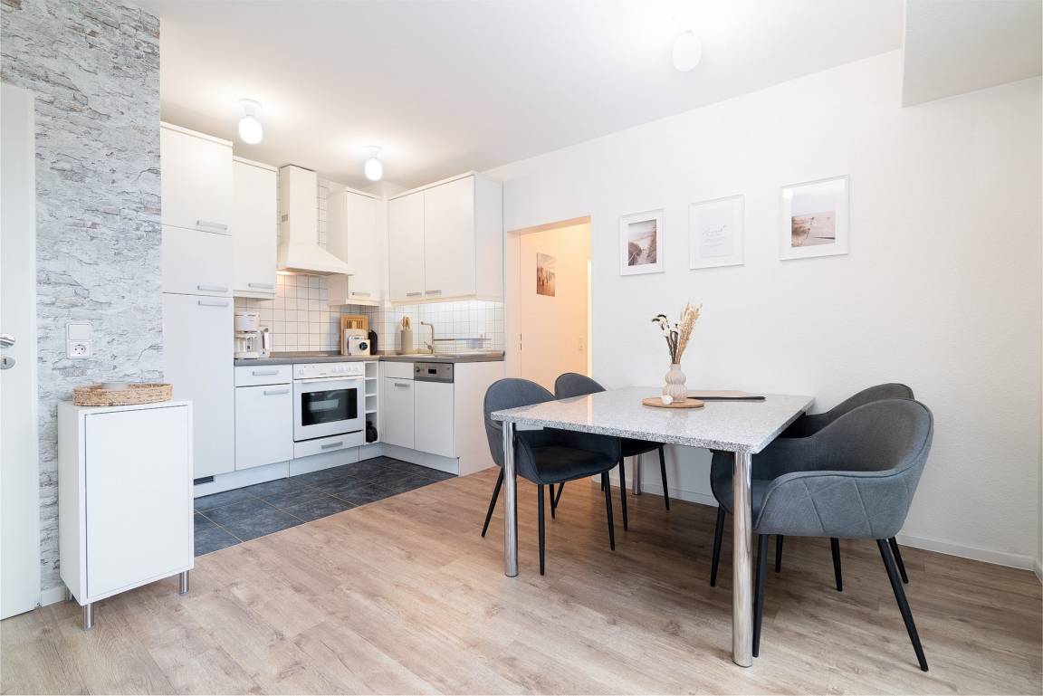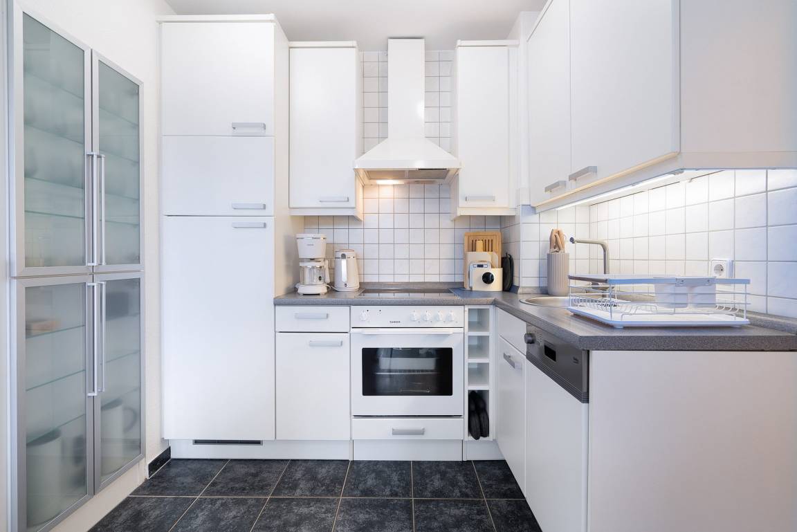 Zum Wohnbereich offene voll ausgestattete Küchenzeile mit 4-Platten-Cerankochfeld, Kühlschrank, Backofen und Spülmaschine. Ein Toaster, ein Wasserkocher und eine Kaffeemaschine sowie eine Kaffeekapselmaschine stehen ebenfalls zur Verfügung.