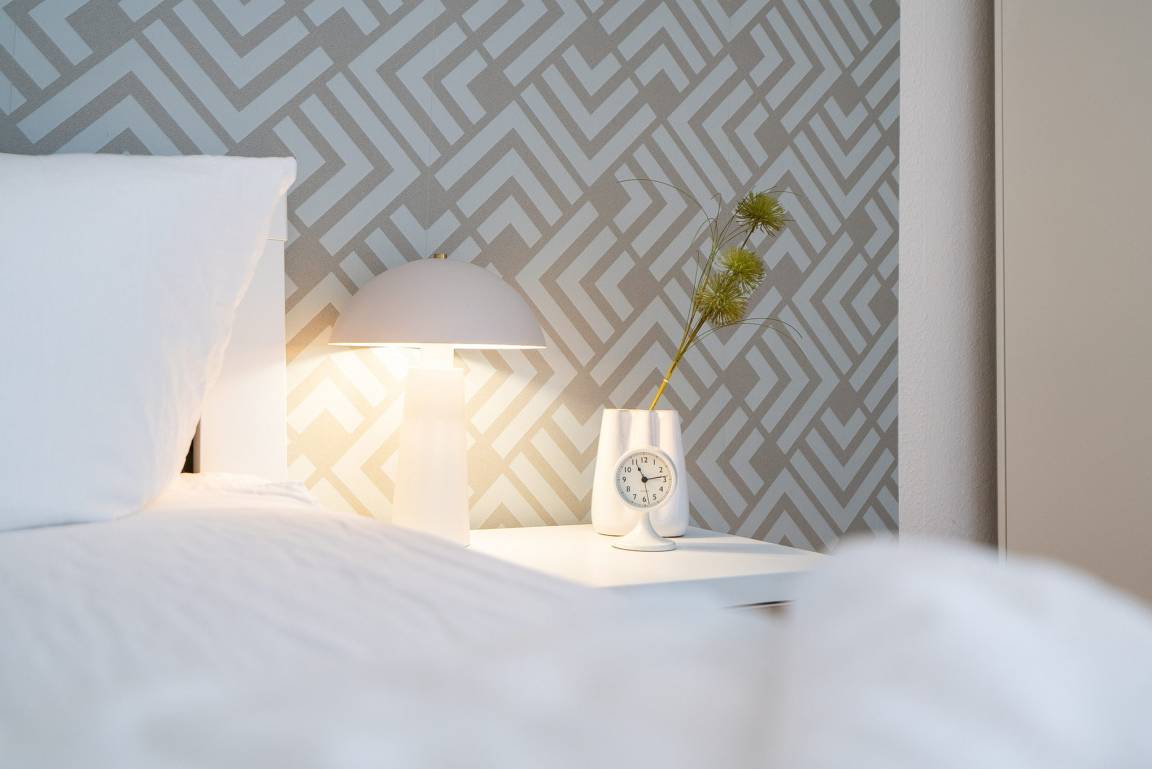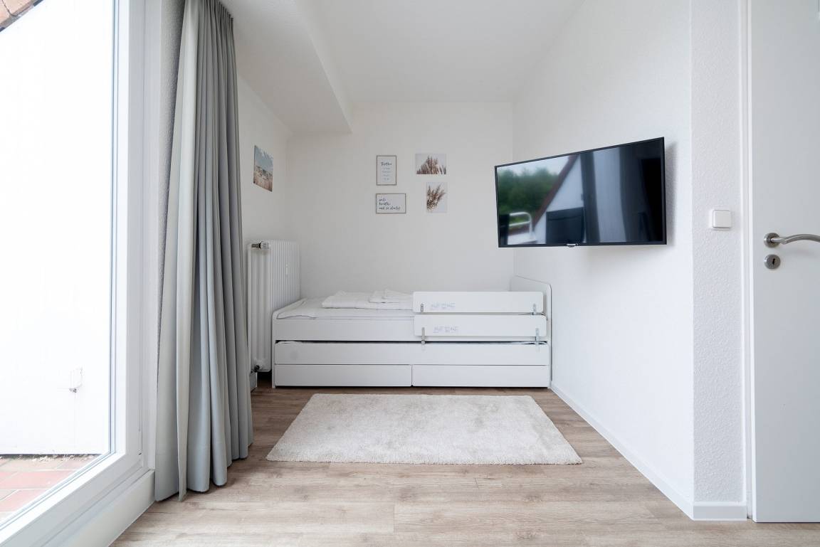 Helles freundliches Schlafzimmer mit Zugang zur zweiten Loggia. Das Zimmer verfügt über ein Doppelbett (2x90x200cm), ein Ausziehbett mit zwei Matratzen (je 90x200cm) auf unterschiedlicher Höhe, einem Sessel und einen großzügigen Kleiderschrank. Zur Unterhaltung steht auch im Schlafzimmer ein 32 Zoll Smart TV zur Verfügung. Der Boden ist mit Designer-Planken ausgelegt, das Fenster lässt sich mit einem Vorhang verdunkeln.