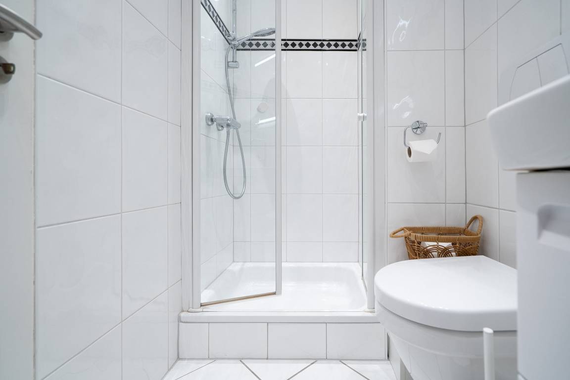 Hell gefliestes Badezimmer mit Dusche, WC und Waschbecken.