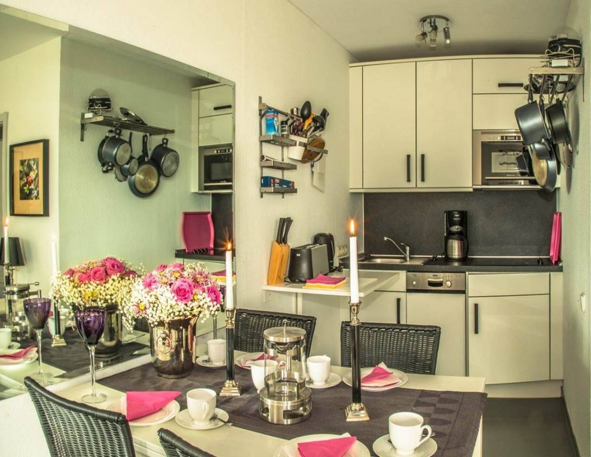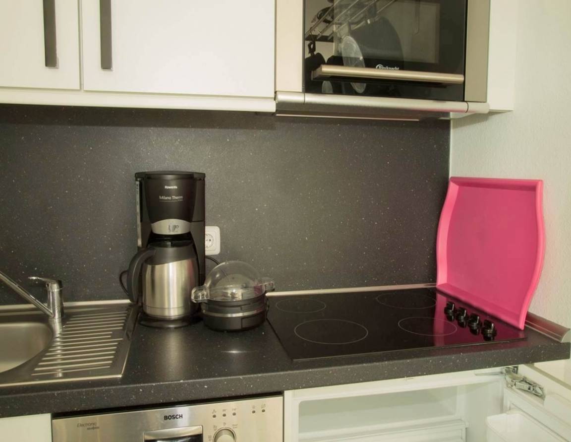 Der Wohnbereich ist mit einer gemütlichen Sitzecke (mit Schlaffunktion), einer offenen kleinen Küchenzeile sowie mit einem Essplatz versehen. Von hier aus gelangen Sie auf den möblierten Seeblick-Balkon. Die kleine Küchenzeile ist u.a. mit einem 4-er Induktionsplattenherd, einer Mikrowelle, Heißluftfritteue 3.5 l , einer kleinen Geschirrspülmaschine, einem Toaster, Wasserkocher, Kaffee- und Nespressomaschine ausgestattet. Ein Sony 42" LCD-TV mit BluRay-Player (auch DVD) sowie ein Internetradio sind vorhanden. Das Fernsehangebot beinhaltet das Sky/WOW-Programm mit den Modulen Fußball Bundesliga/Champions League, dazu über Apple TV den Zugang zu DAZN; Amazon Prime, Netflix und Apple Music. Das separate Schlafzimmer ist mit einem Doppelbett (180/210) mit Taschenfederkernmatrazen ) versehen. Das Bad verfügt über eine Badewanne (mit Duschmöglichkeit), Waschbecken und WC. Alle Räume sind verdunkelbar.