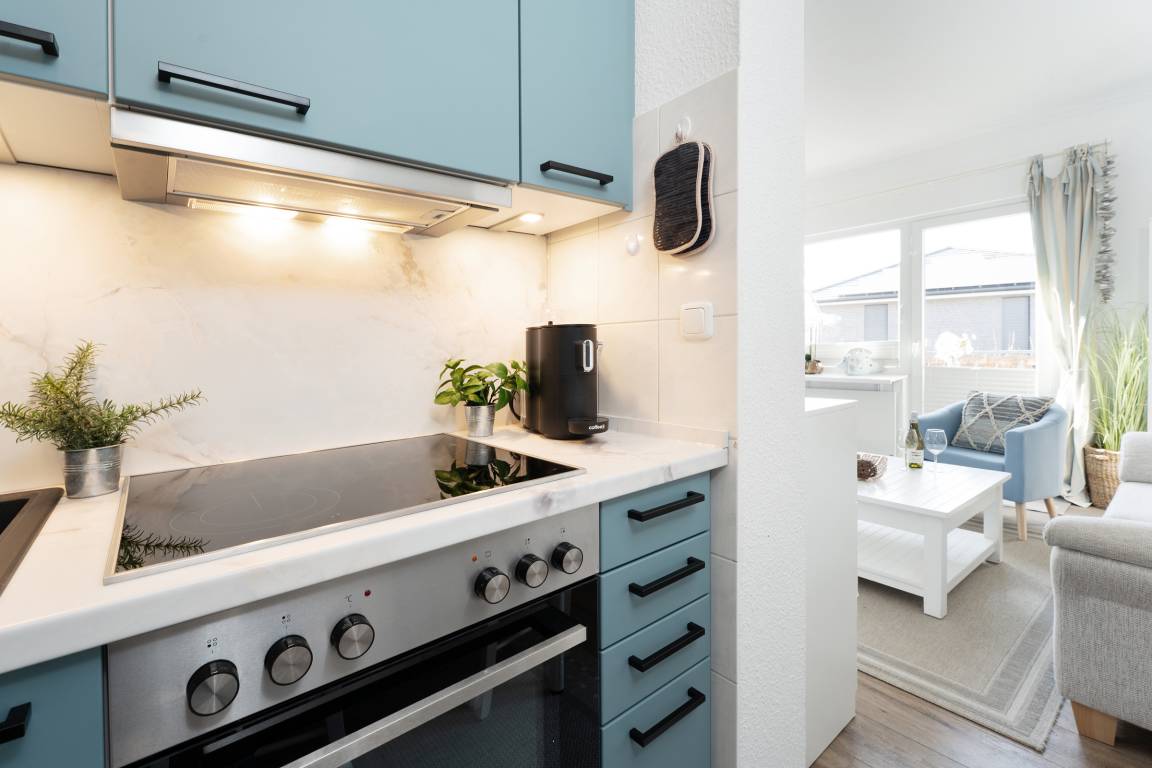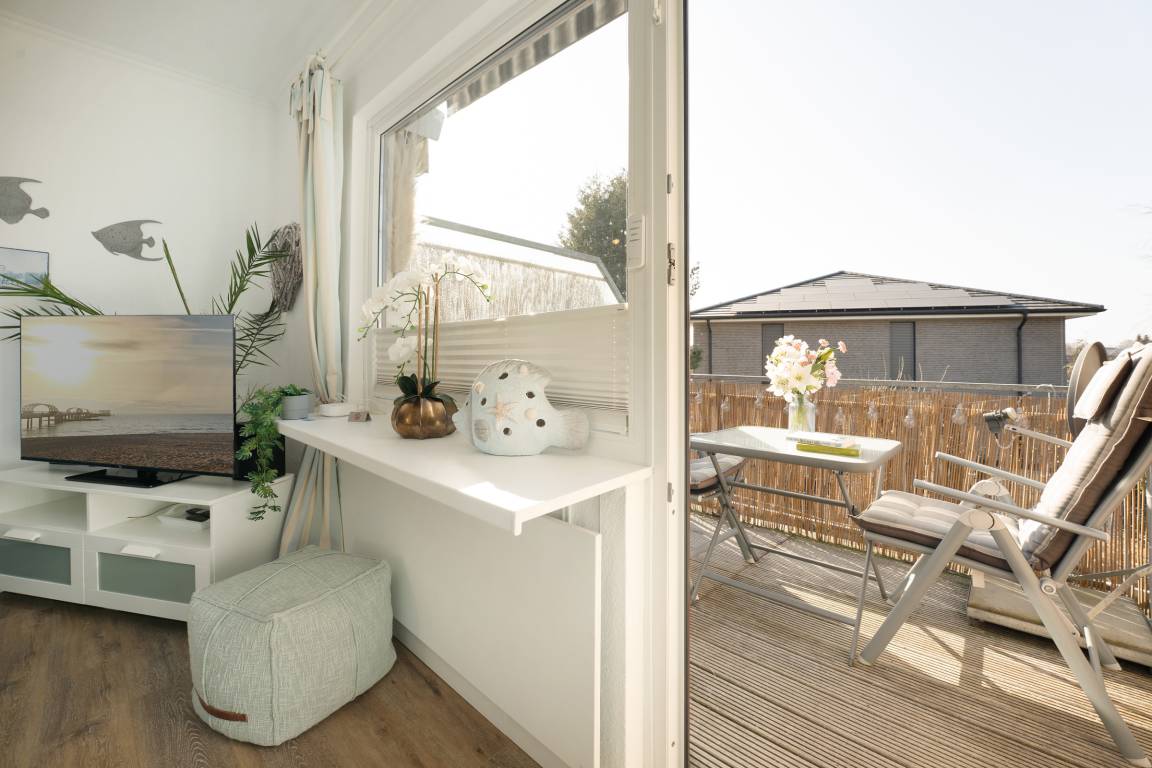 Von Ihrem Wohn-Schlafbereich mit Doppelbett (180x200 cm), Sofa, Sessel und Fernsehecke abgehend, befindet sich die angrenzende Küche (separat, jedoch mit offenem Zugang) die mit guter Ausstattung vom Ceranherd bis zur Spülmaschine begeistert. Vom Wohnbereich aus geht es direkt auf den möblierten Balkon, eine Markise schützt vor zu starker Sonneneinstrahlung. Starten Sie in den Tag in Ihrem freundlichen Duschbad. Ihr Feriendomizil ist durchgehend geschmackvoll ausgestattet und hat ein angenehmes Wohnambiente.