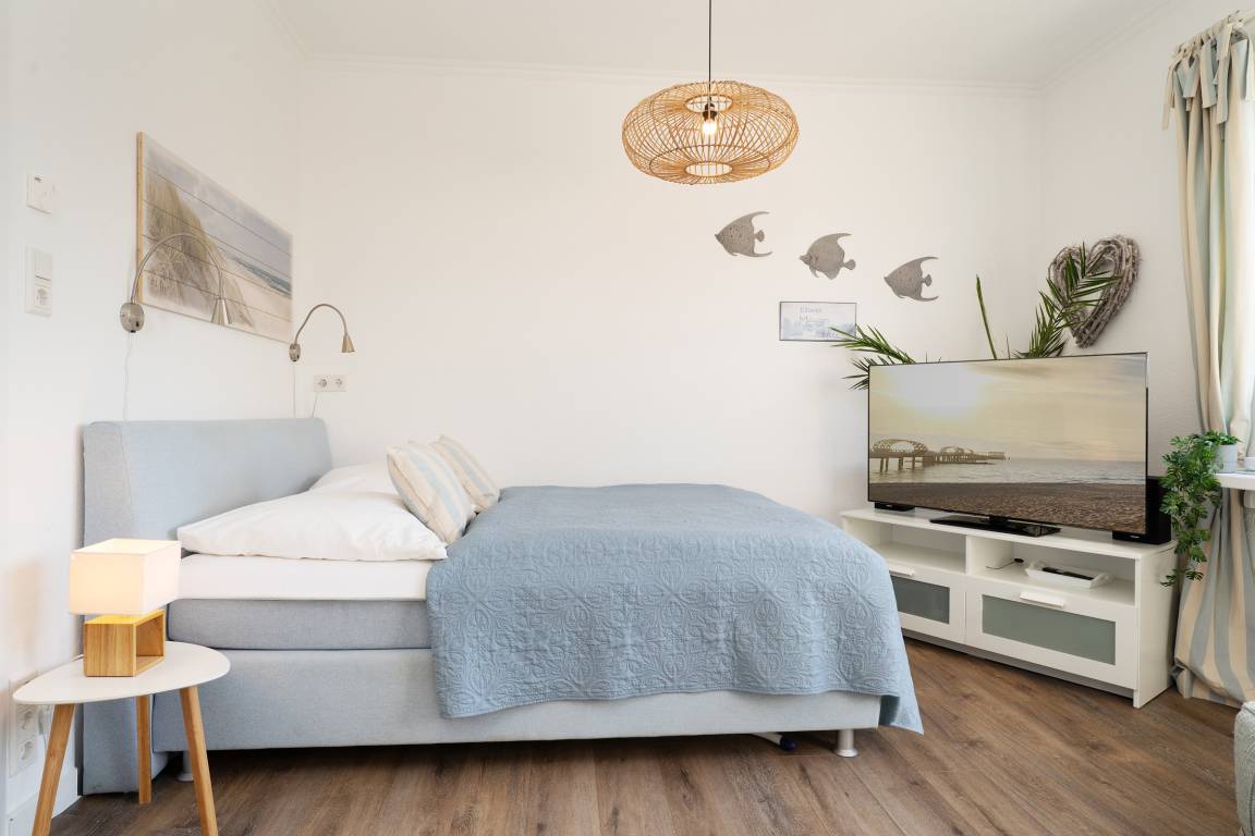 Wohnzimmer: Boxspringbett (180x200 cm), TV, Verdunkelungsjalousien