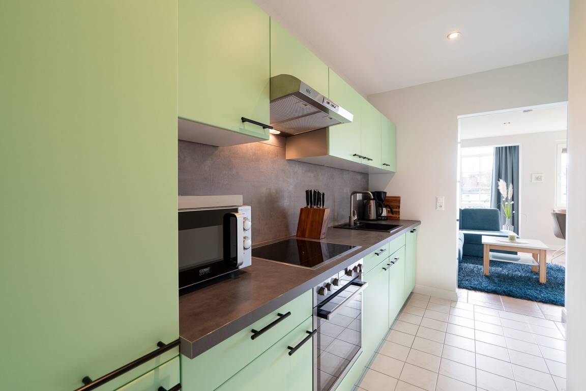 Separate Küche mit 4 Platten-Cerankochfeld, Kühlschrank mit Gefrierfach, Spülmaschine, Backofen und Mikrowelle. Ein Wasserkocher, Kaffeemaschine und Toaster gehören ebenfalls zur Ausstattung.