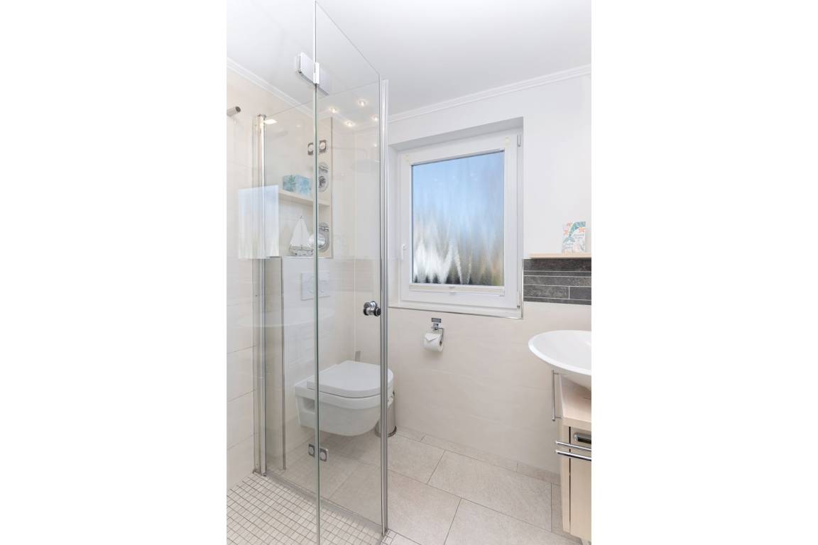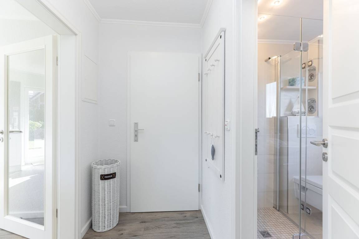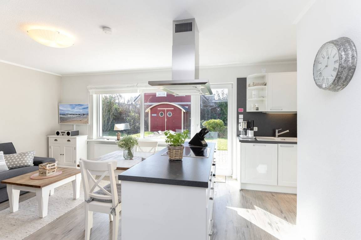 Im separaten Schlafzimmer erwartet Sie ein Doppelbett (2x 160x200), ein Kleiderschrank sowie ein Flachbildfernseher. Als Sichtschutz und Verdunklungsmöglichkeit wurden Plissees angebracht. Vom Flur aus gelangen Sie ins helle Badezimmer, welches über eine bodengleiche Dusche, ein Waschbecken und ein WC verfügt. Für ausreichend Stauraum wurde gesorgt, denn im Waschtischunterschrank haben Sie die Möglichkeit, Ihre Badutensilien zu versauen. Der offene Wohn- und Essbereich mit zwei komfortablen Sofas und einem Flachbildfernseher hat einen fantastischen Ausblick in den grünen Garten. Für ein exklusives Küchenambiente sorgt die voll ausgestattete, ebenfalls offene Küche. Vom Wohn- und Essbereich aus haben Sie Zugang zu einer geschützten Süd-West-Terrasse. Dort können Sie sich auf den Gartenmöbeln oder im eigenen Strandkorb erholen und zur Ruhe kommen. Und wenn es an heißen Sommertagen einmal zu viel Sonne ist, dann lassen Sie bequem die elektrische Markise ausfahren.