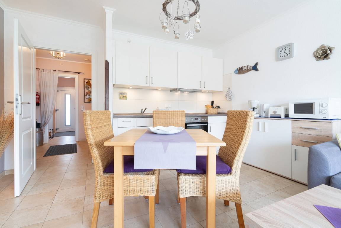 Komplett eingerichtete, zum Wohnzimmer offene Küche mit Cerankochfeld, Backofen, Dunstabzugshaube, Geschirrspüler, Mikrowelle, Toaster, Wasserkocher, Eierkocher, Kaffeemaschine und Kühlschrank mit kleinem Gefrierfach.