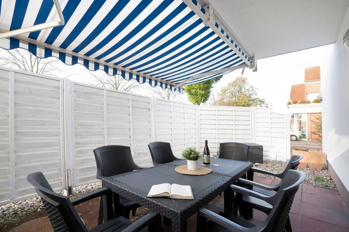 Genießen Sie Ruhe und Entspannung im separaten Schlafzimmer mit luxuriösem Boxspringbett (2x 90x200cm, durchgehender Topper) geräumigem Kleiderschrank für Ihre Urlaubsgarderobe sowie 2. Fernseher. Das zweite Schlafzimmer bietet ebenfalls reichlich Platz und Freiraum, denn hier gibt es bis zu 3 Schlafmöglichkeiten durch ein Etagenbett mit ausziehbarem Einzelbett (3x 90x200cm), sowie einen Kleiderschrank. Vom Wohnzimmer mit bequemer Couch, Flat-TV und Blu-Ray-Player führt ein Zugang auf die möblierte Terrasse. Hier schützt eine Markise im Sommer vor zu starker Sonneneinstrahlung. Genießen Sie die Möglichkeit Ihre herrlichen Urlaubstage morgens mit dem ersten Kaffee auf der Terrasse und einer Prise Ostseeluft in der Nase zu beginnen oder mit einem stilvollen Sundowner am Abend ausklingen zu lassen! Die offene Küche ist toll ausgestattet, sodass Ihrem selbst kreierten Urlaubsdinner nichts im Wege steht. Hier helfen Annehmlichkeiten wie Cerankochfeld, Spülmaschine und Mikrowelle mit Backofenfunktion. Das stilvolle Designbad begeistert mit großzügiger, bodentiefer Dusche, WC, Waschtisch, Fön und Fußbodenheizung. Elektrische Außenjalousien sorgen in Ihrem Logis für Lichtschutz, angenehme Verdunklung und erholsame Nächte.