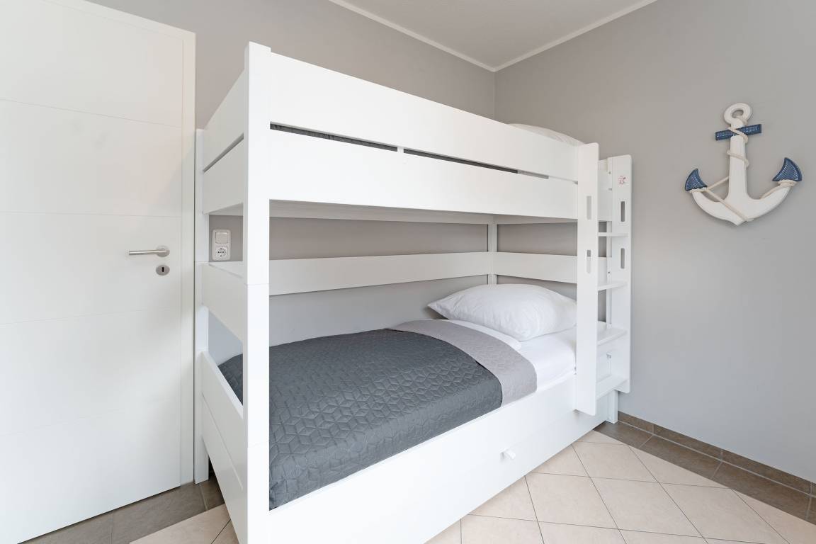 Schlafzimmer 2: 1 Etagenbett mit ausziehbarem Einzelbett (je 90x200 cm), Außenjalousie