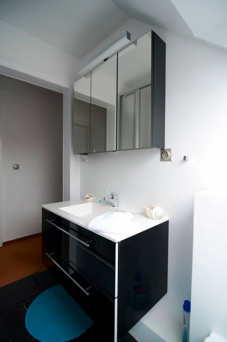 Obergeschoss: Geräumiges, helles, 21 m² großes Schlafzimmer in Landhausoptik mit 2x2 m großem Doppelbett, 3-teiligem Kleiderschrank mit Spiegel, kleinem Schreibtisch, Sidebord und kleiner Bank. Dank Aussenrolläden sind alle Räume des Hauses nach Belieben zu verdunkeln. Kinderzimmer mit Ausziehbett, Schrank, Veluxfenster mit Verdunklungsplissee. Badezimmer in Schwarz/weiß-Optik, Waschtisch, Spiegelschrank, Toilette, Dusche und Badewanne separat. Fön vorhanden.