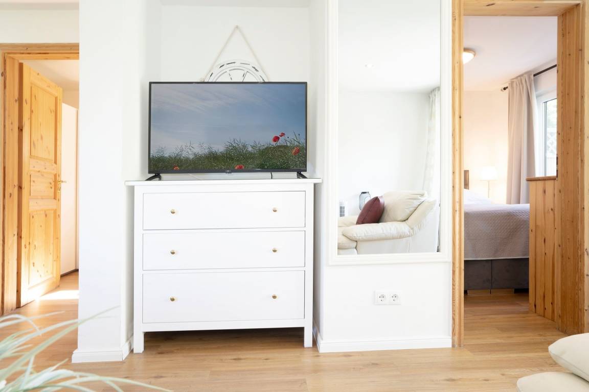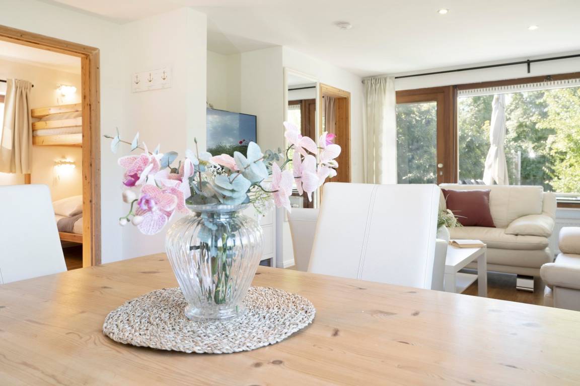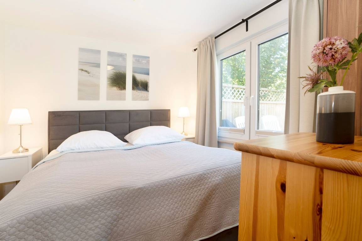 In der Wohnung gibt es ein Wohnzimmer sowie zwei separate Schlafzimmer. Ein Schlafzimmer verfügt über ein Doppelbett (2x 90x200 cm, durchgehender Topper), das zweite Schlafzimmer bietet Ihnen ein Etagenbett (je 90x200 cm). Eine gemütliche Küche u.a. mit Filterkaffeemaschine und ein Badezimmer erwarten Sie ebenfalls. Vom Wohnzimmer aus gelangen Sie direkt auf die sonnige Terrasse und in den großzügigen Garten, der nicht komplett eingezäunt ist. Wenn das Wetter einmal nicht mitspielt, können Sie sich die Zeit mit dem Smart TV im Wohnzimmer vertreiben.