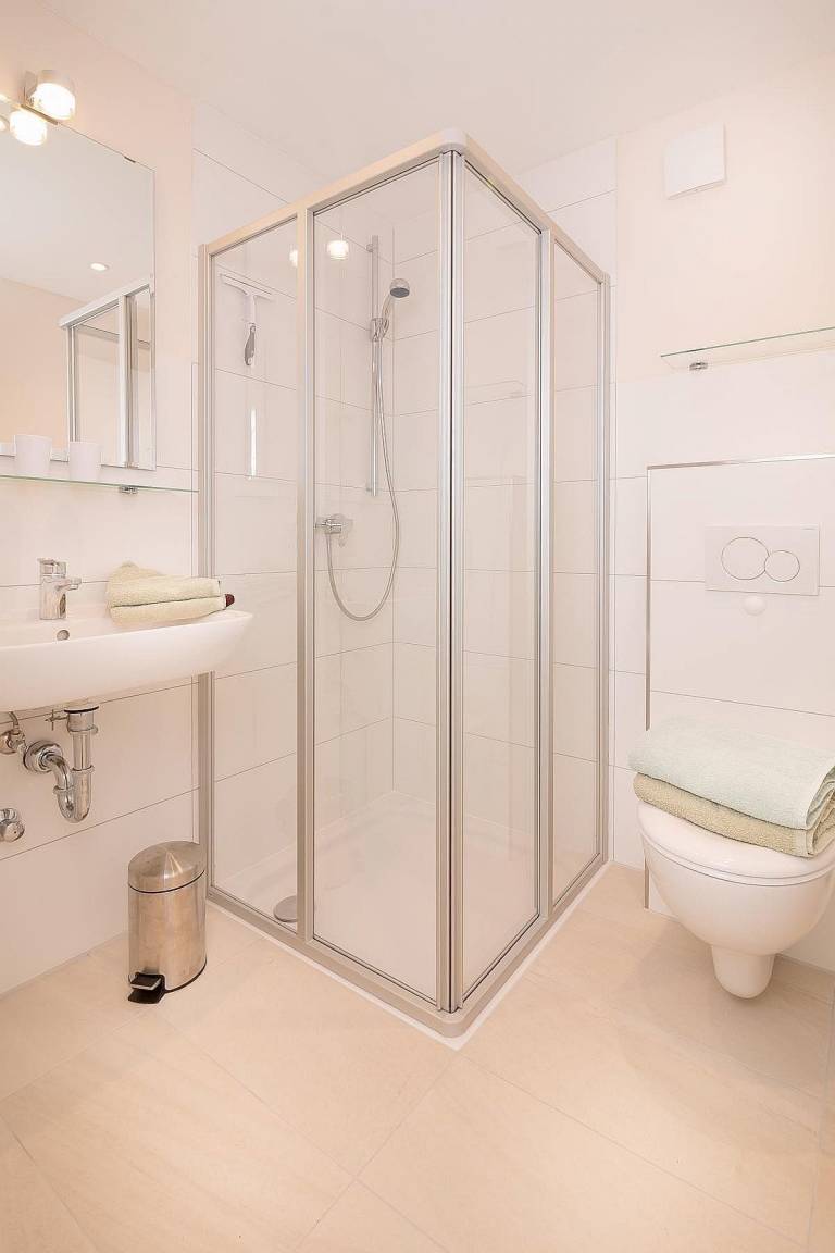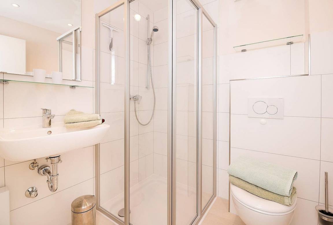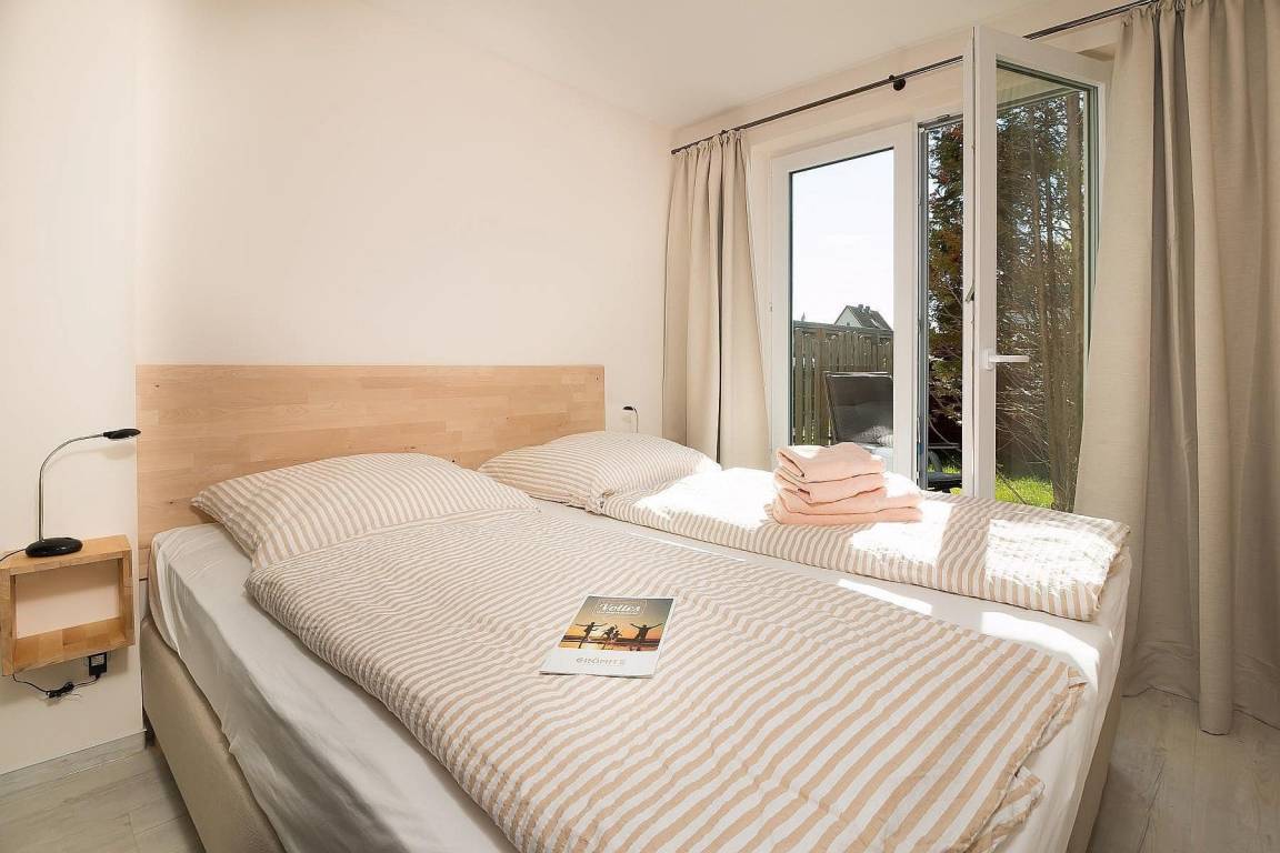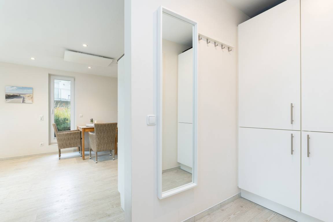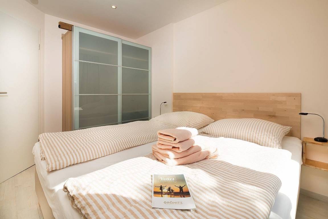 Hinter dem Wohnraum, in einer Wandnische gibt es einen Garderobenschrank. Gegenüber liegen das Schlafzimmer, ausgestattet mit Boxspringbett (2 x 90 x 200 cm) und Kleiderschrank und das Bad mit Dusche und WC.