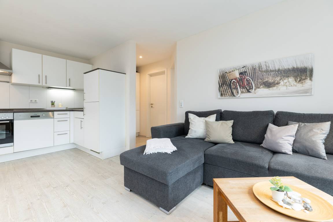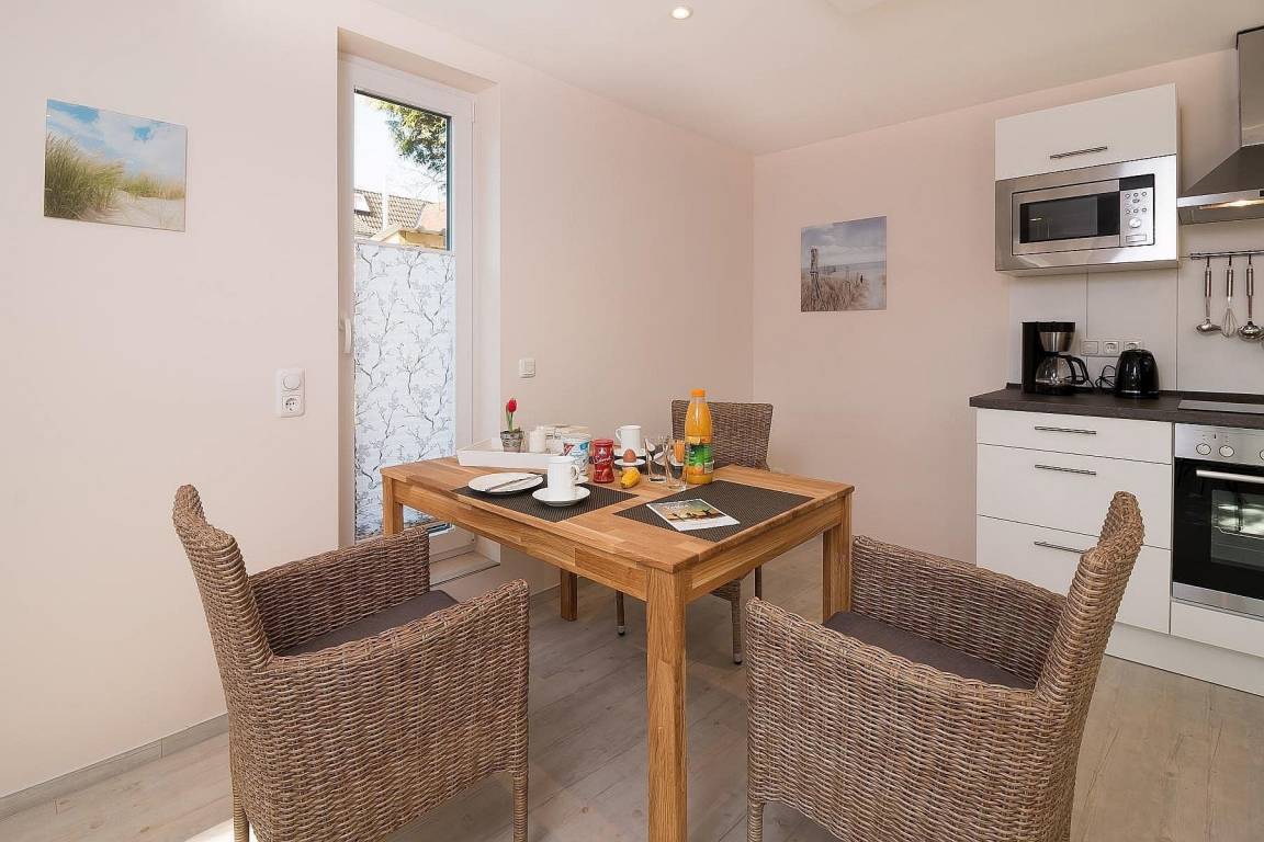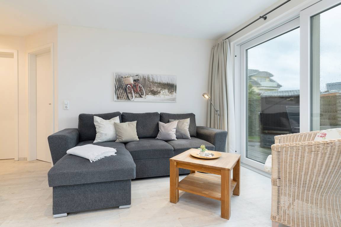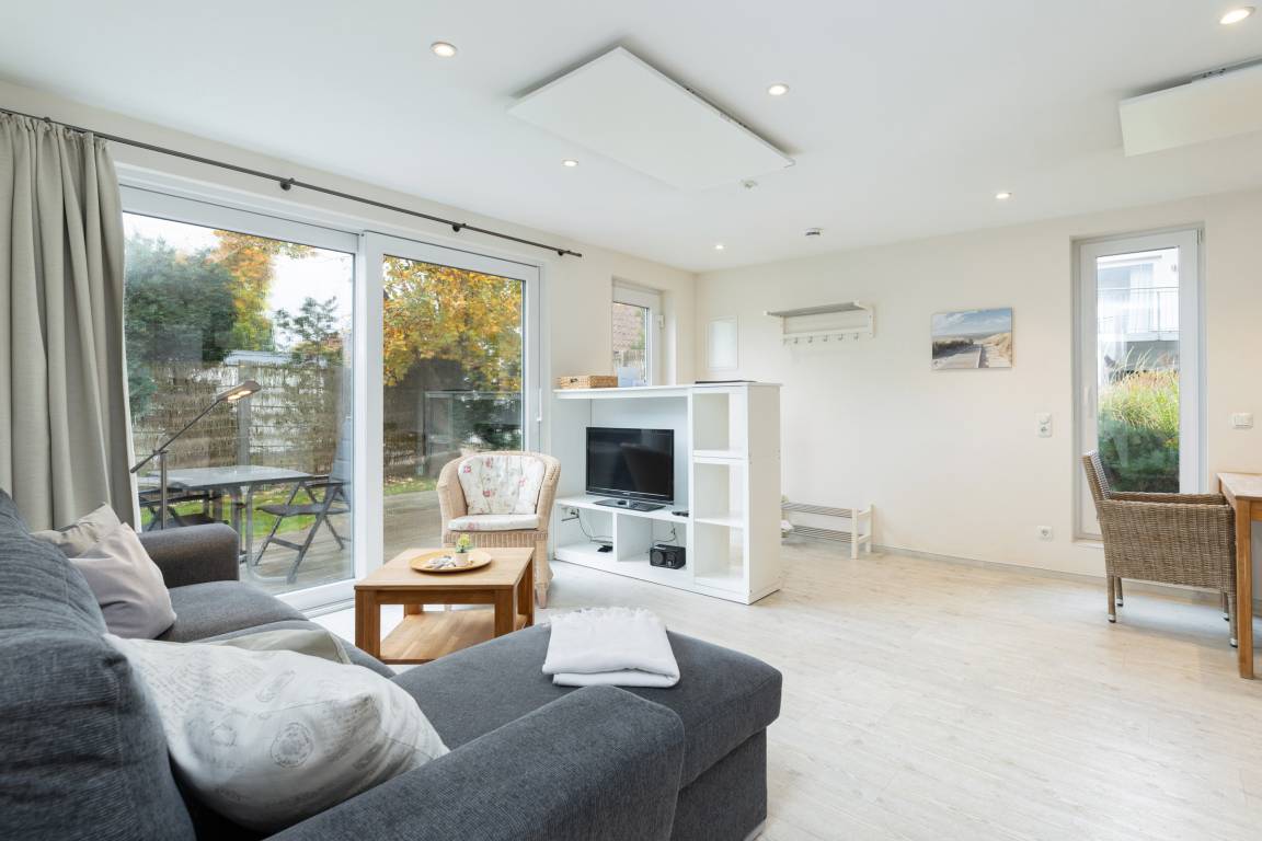 Über die Holzterrasse mit Strandkorb gelangen Sie in den hellen Wohnraum mit großer Küchenzeile, Esstisch und Stühlen und bequemen Sofa mit Ottomane (und Bettfunktion). Von hier aus genießen Sie den Blick auf Terrasse und Garten oder machen sich einen gemütlichen TV-Abend.