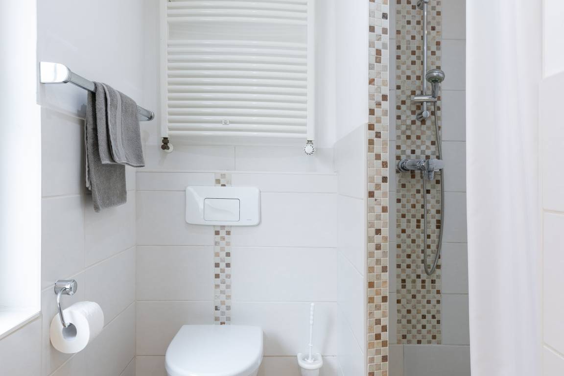 Das neue Duschbad mit Bodendusche ist ansprechend modern gestaltet – außerdem gibt es ein separates WC mit Handwaschbecken.