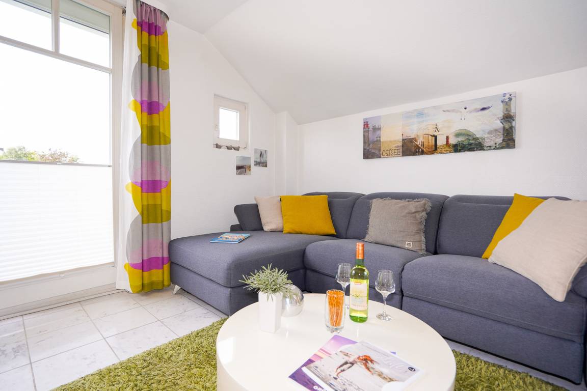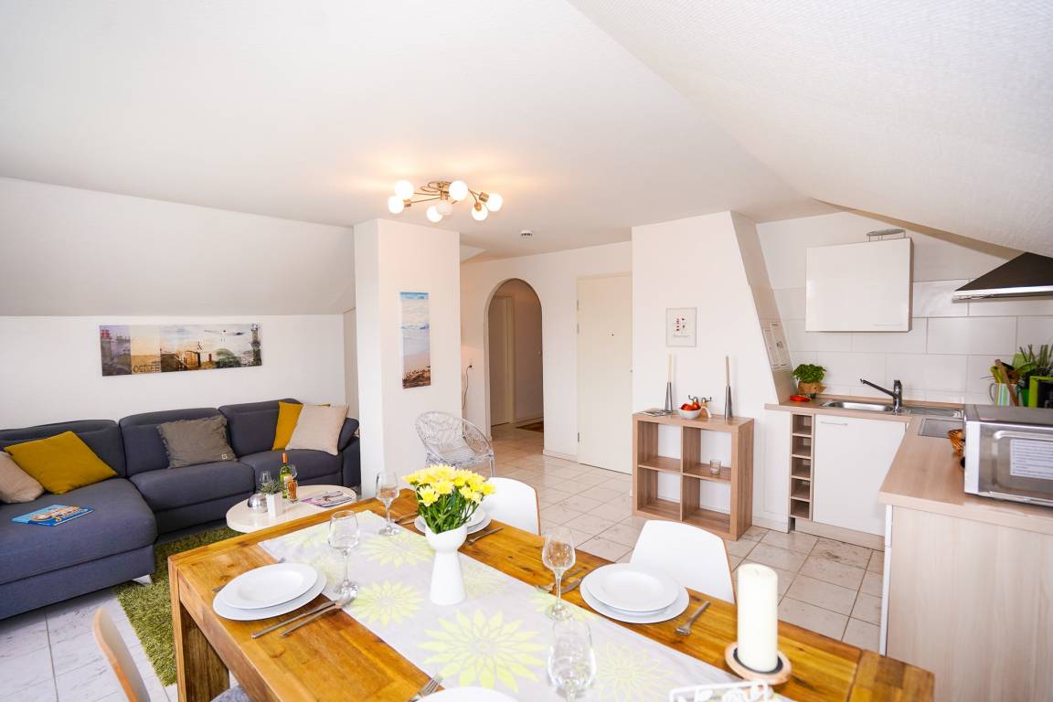 Das Wohnzimmer ist mit einem Ecksofa, einem Beistelltisch und einem großen Esstisch ausgestattet. Zur Unterhaltung stehen im Wohnbereich ein Flachbild TV und eine Musikanlage mit CD/Blu-Ray zur Verfügung. Angrenzend erreichen Sie den mit einem Strandkorb, Tisch und Stühlen möblierten Balkon in Süd-West Ausrichtung.