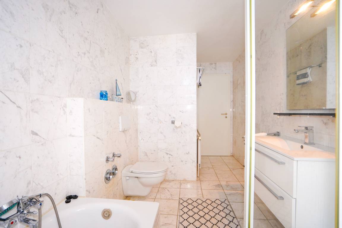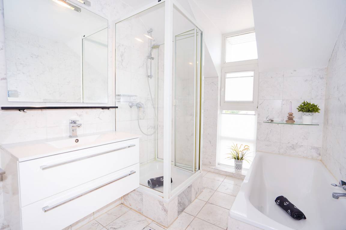 Beide Schlafzimmer verfügen über große Doppelbetten, Kleiderschränke und jeweils einen Sessel. In einem Schlafzimmer ist zusätzlich ein weiterer Fernseher vorhanden. Das in Marmor gehaltene Badezimmer ist mit einer Dusche und einer Badewanne ausgestattet. Zusätzlich ist ein Gäste-WC vorhanden.