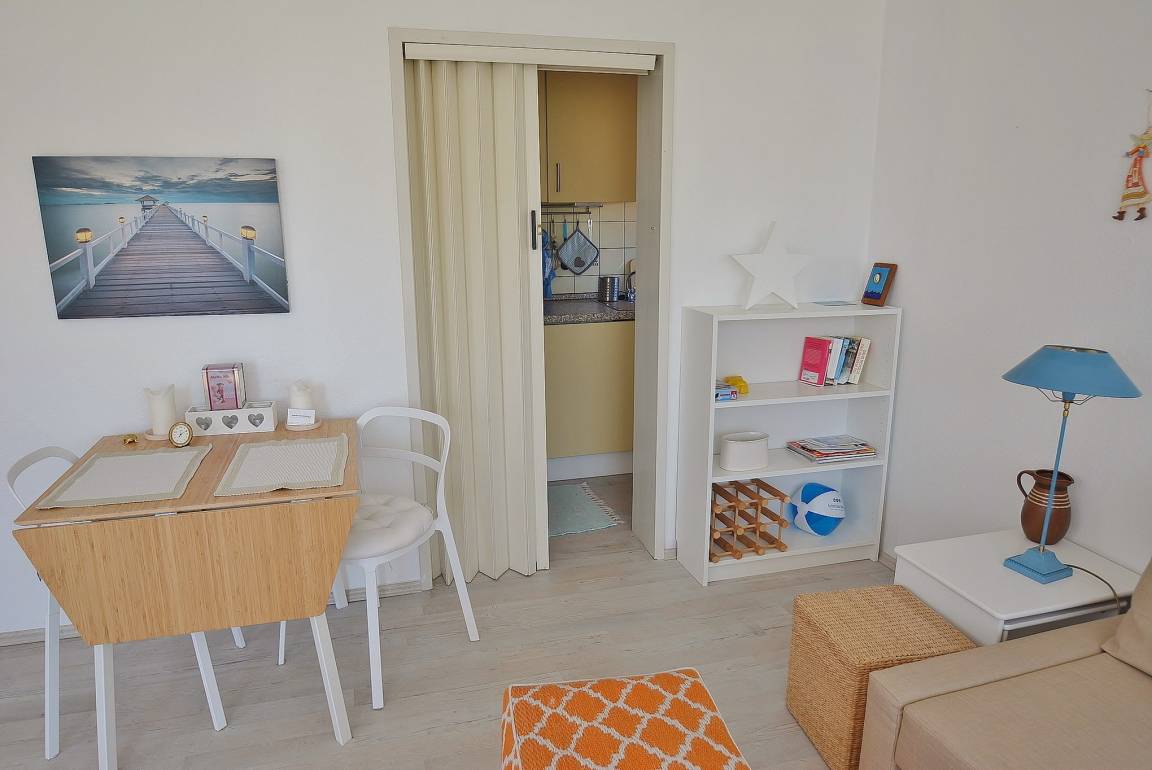 Helles, freundliches Wohn- und Esszimmer mit Zugang zum Balkon in süd-östliche Richtung. Das Wohn- und Esszimmer ist mit einer Eckcouch und einem Essplatz für 2 Personen ausgestattet. Zur Unterhaltung steht ein Fernseher (Bildschirmdiagonale: 1,20 m) und eine Mini-Stereo-Anlage zur Verfügung. Das Wohn- und Esszimmer ist mit Laminatboden ausgelegt. Das Fenster lässt sich durch ein Außenrollo vollständig verdunkeln.