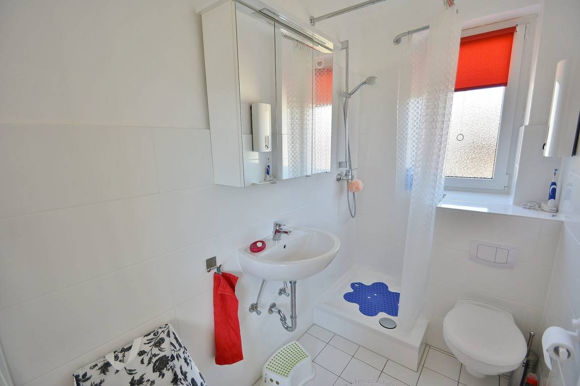 Hell gefliestes Tageslichtbad mit Dusche, WC und Waschbecken.