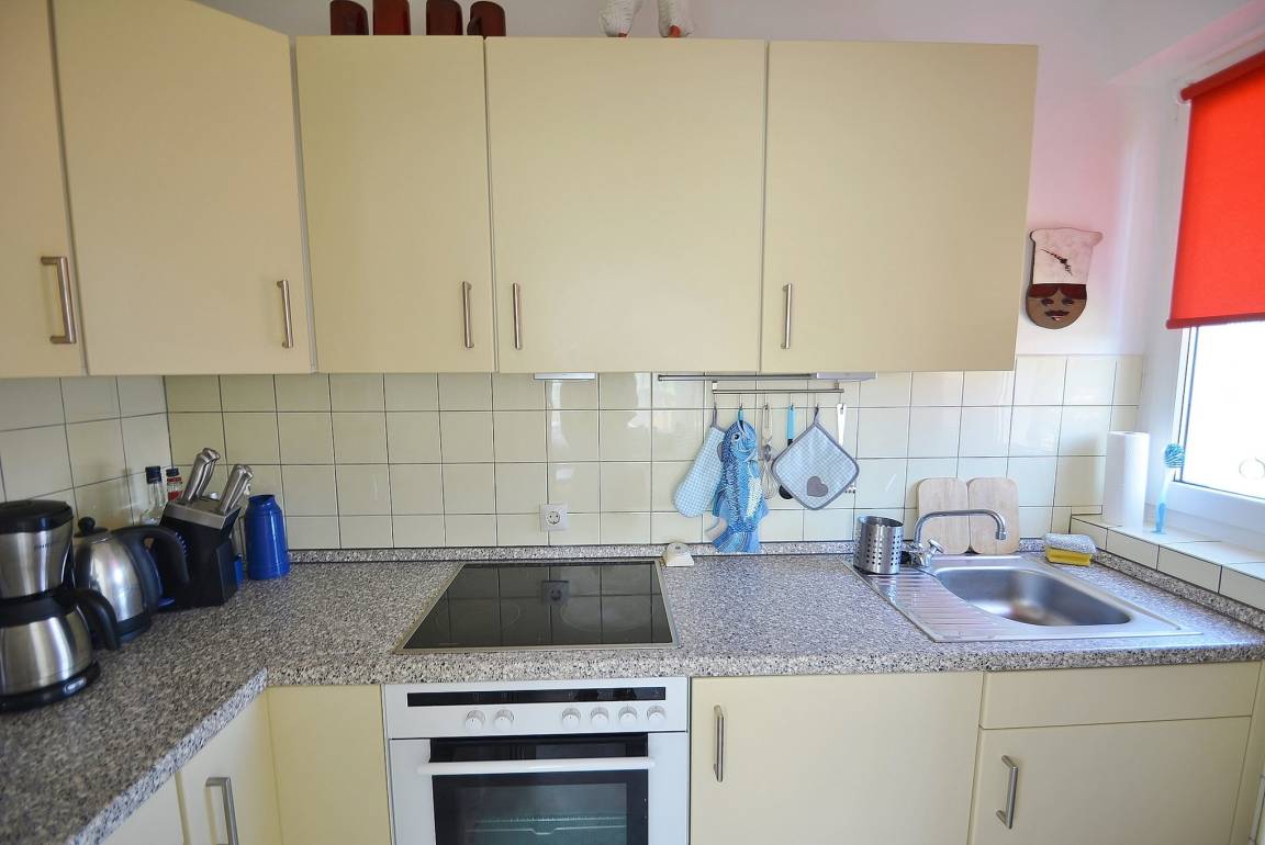 Kleine, separate Küche mit Backofen, 4-Platten Cerankochfeld, Wasserkocher, Toaster, Kaffeemaschine und Kühlschrank mit kleinem 3-Sterne Gefrierfach.