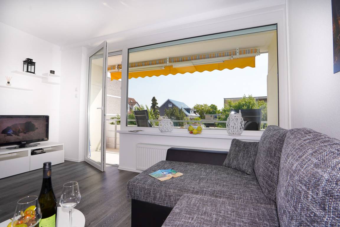 Im Wohnzimmer befindet sich eine Schlafcoach mit Platz für zwei Personen. Von hier aus gelangen Sie auf den überdachten Balkon mit Süd-West-Ausrichtung. Bei zu viel Sonne spendet Ihnen die vorhandene Markise Schatten. Entspannen Sie hier nach einem ausgiebigen Tag am Strand.