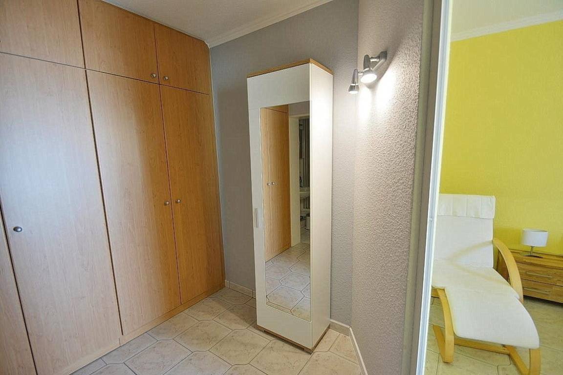 Separates, modern ausgestattetes Schlafzimmer mit direktem Zugang zum Balkon. Das Schlafzimmer ist mit einem Doppelbett (2x 90x200cm), einer Kommode und einem Kleiderschrank ausgestattet. Das Zimmer ist gefliest, das Fenster lässt sich durch ein Außenrollo vollständig verdunkeln.