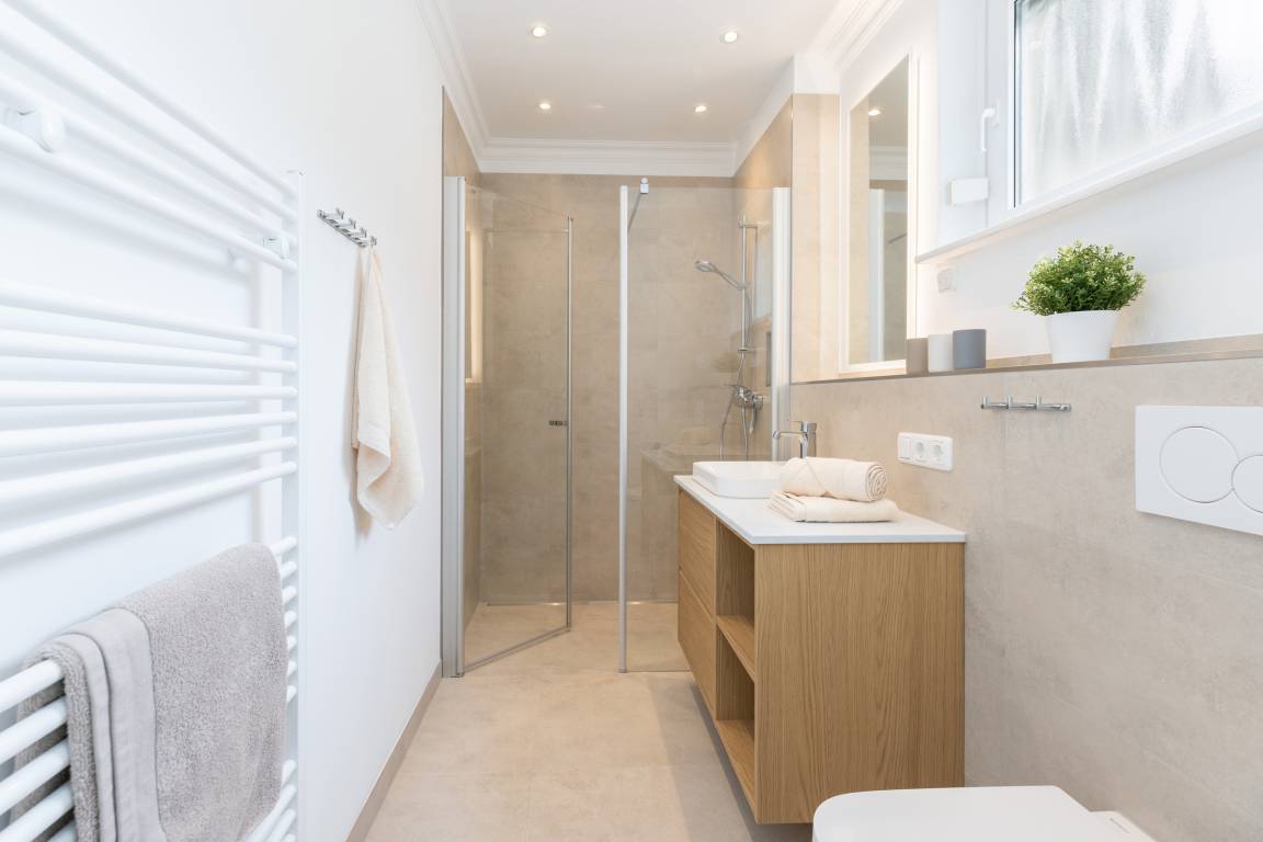 - Hochmodernes Badezimmer: Hell und einladend mit begehbarer Dusche