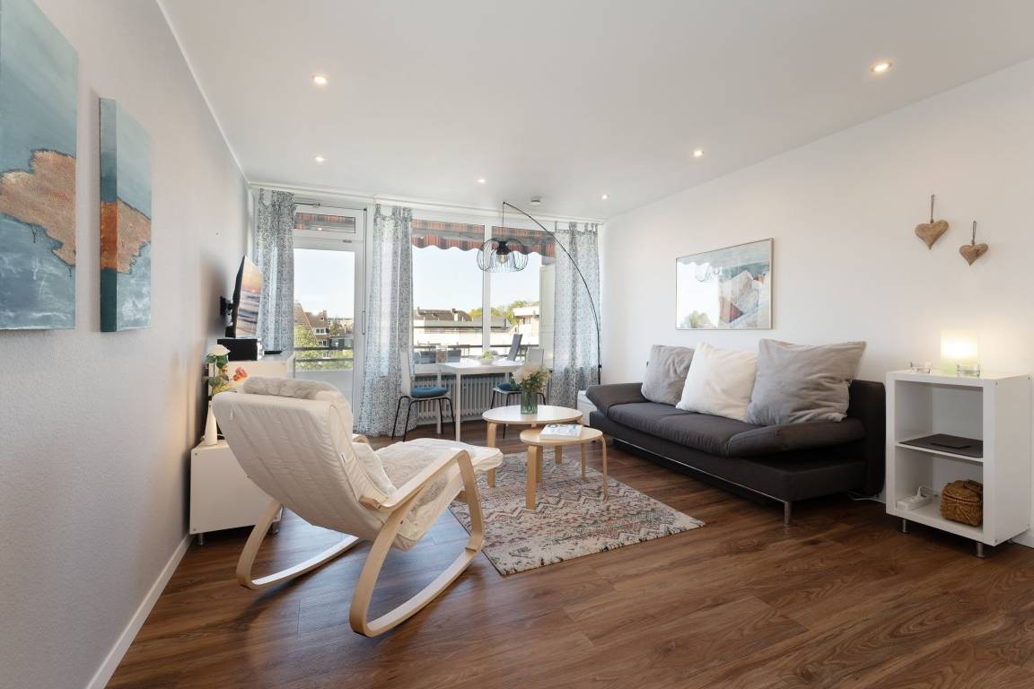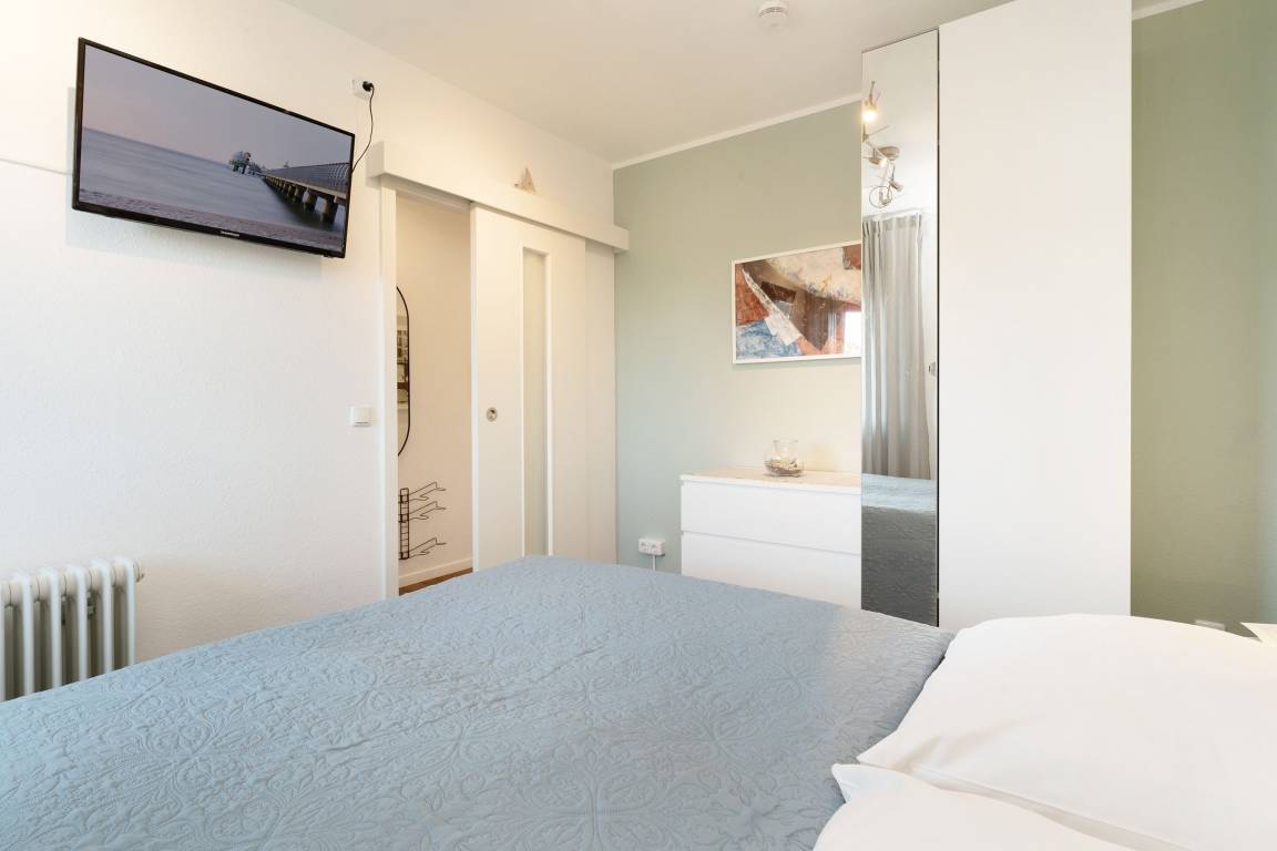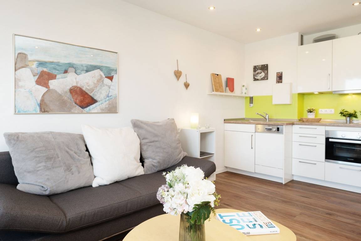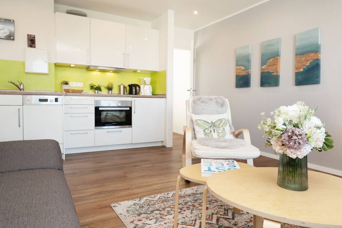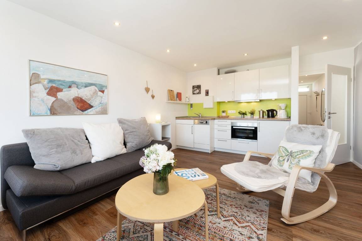 Mittelpunkt der Wohnung bildet der kombinierte Wohn-/Essbereich mit integrierter Küchenzeile und direktem Balkonzugang. Hier lässt es sich auf dem großzügigen Sofa auch an Regentagen gemütlich machen, ein Flachbildfernseher sowie eine Bluetooth-Musikbox sorgen für Unterhaltung. LED Einbaustrahler in der Zimmerdecke sorgen für warmes Licht und eine heimelige Atmosphäre. Das Sofa lässt sich abends bei Bedarf mit wenigen Handgriffen bequem in eine Schlafstätte (140x200 cm)verwandeln. Auf dem Balkon mit seitlichem, saisonalen Ostsee-Fernblick können Sie die Sonne vom Morgen bis zum Nachmittag genießen oder unter der Markise im Schatten sitzen. Ein Tisch mit zwei Stühlen lädt dort zum gemütlichen Frühstück inklusive herrlicher Ostseeluft ein. Die Küche ist voll ausgestattet und lässt keine Wünsche offen, vom Induktionsherd über eine Spülmaschine und einen Backofen, sowie einen Kühlschrank mit Gefrierfach finden Sie hier alles, was einem das Kochen im Urlaub zum Vergnügen macht. Ein ausziehbarer Esstisch rundet den Essbereich ab. Im Schlafzimmer mit gemütlichem Doppelbett (2x 80x200 cm) befindet sich durch einen Kleiderschrank und eine Kommode ausreichend Staumöglichkeit für Ihre Urlaubskleidung. Das geschmackvolle und moderne Badezimmer ist hell gefliest und mit allem ausgestattet, was Sie für die körperliche Hygiene benötigen. Neben WC, Dusche, Waschtisch mit Unterbauschrank und Spiegel steht Ihnen auch ein Föhn zur Verfügung. Die Wohnung ist durchgehend mit einem Designerboden in Holzoptik versehen. Der WLAN-Anschluss ist inklusive.