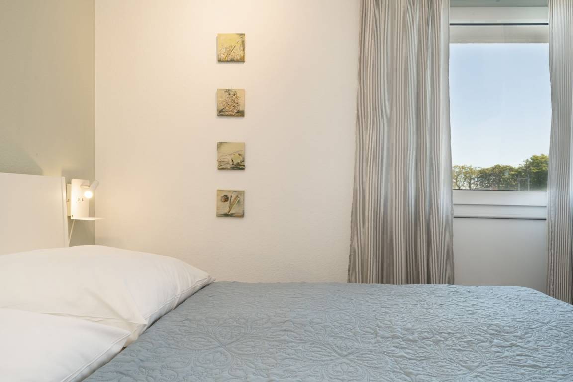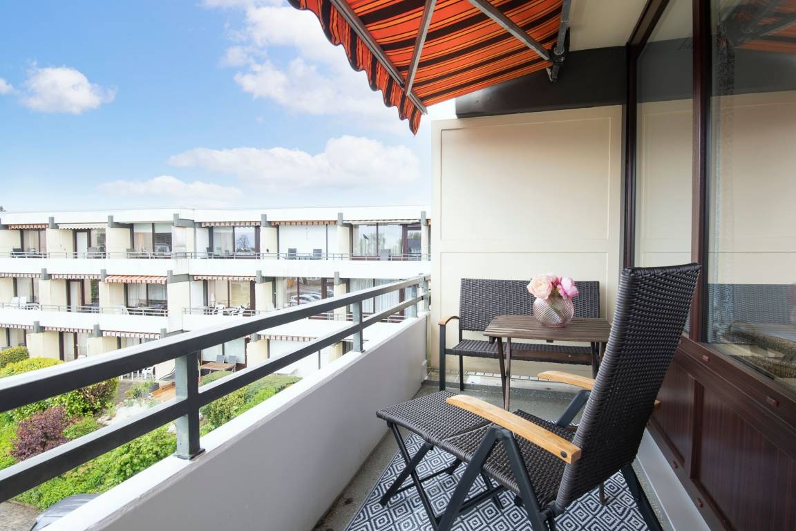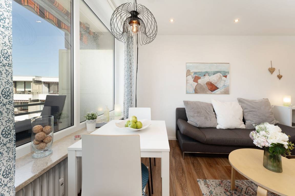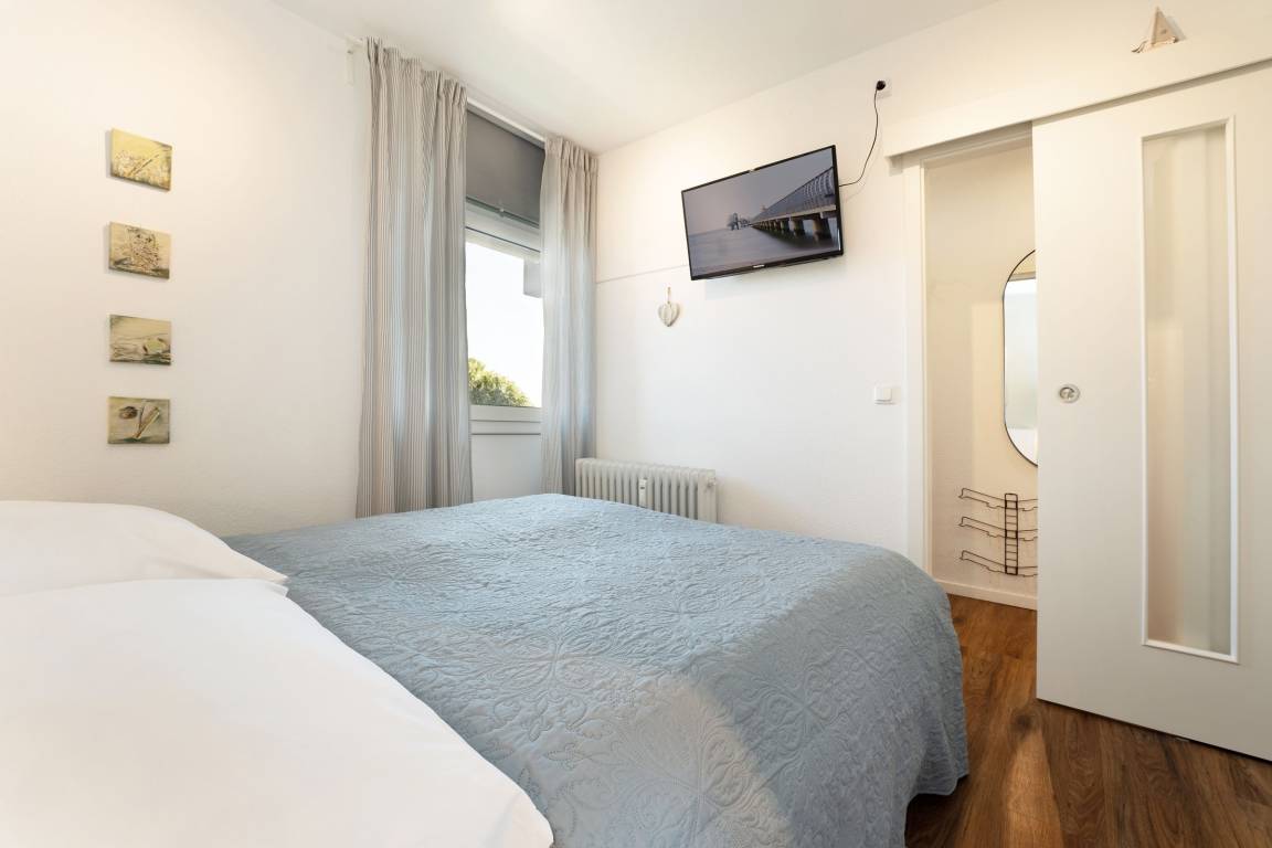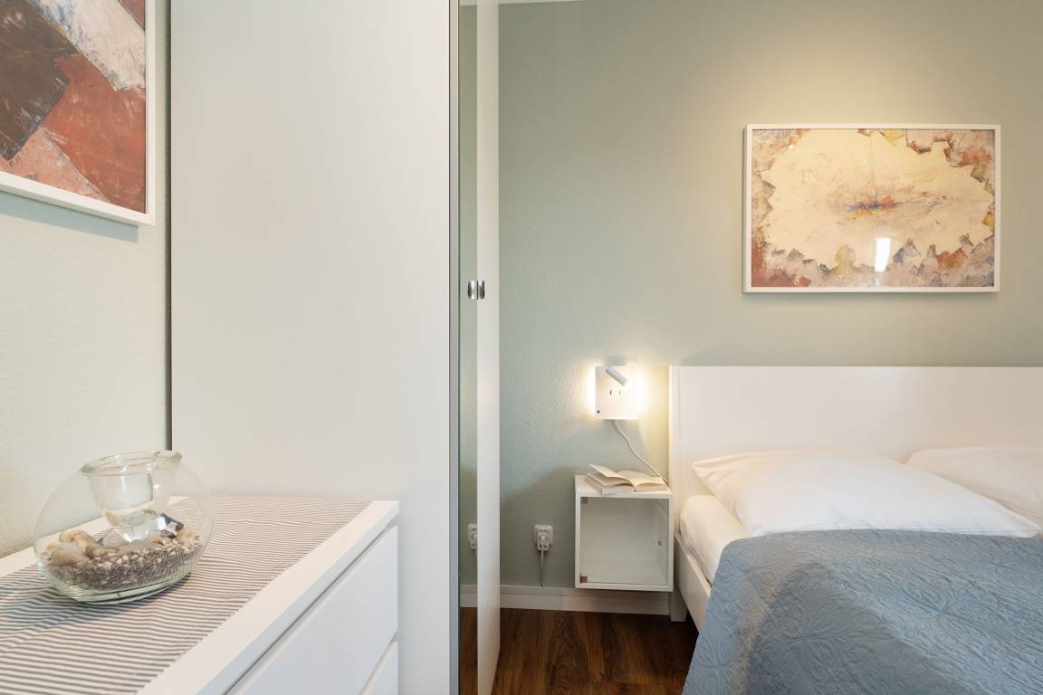 Mittelpunkt der Wohnung bildet der kombinierte Wohn-/Essbereich mit integrierter Küchenzeile und direktem Balkonzugang. Hier lässt es sich auf dem großzügigen Sofa auch an Regentagen gemütlich machen, ein Flachbildfernseher sowie eine Bluetooth-Musikbox sorgen für Unterhaltung. LED Einbaustrahler in der Zimmerdecke sorgen für warmes Licht und eine heimelige Atmosphäre. Das Sofa lässt sich abends bei Bedarf mit wenigen Handgriffen bequem in eine Schlafstätte (140x200 cm)verwandeln. Auf dem Balkon mit seitlichem, saisonalen Ostsee-Fernblick können Sie die Sonne vom Morgen bis zum Nachmittag genießen oder unter der Markise im Schatten sitzen. Ein Tisch mit zwei Stühlen lädt dort zum gemütlichen Frühstück inklusive herrlicher Ostseeluft ein. Die Küche ist voll ausgestattet und lässt keine Wünsche offen, vom Induktionsherd über eine Spülmaschine und einen Backofen, sowie einen Kühlschrank mit Gefrierfach finden Sie hier alles, was einem das Kochen im Urlaub zum Vergnügen macht. Ein ausziehbarer Esstisch rundet den Essbereich ab. Im Schlafzimmer mit gemütlichem Doppelbett (2x 80x200 cm) befindet sich durch einen Kleiderschrank und eine Kommode ausreichend Staumöglichkeit für Ihre Urlaubskleidung. Das geschmackvolle und moderne Badezimmer ist hell gefliest und mit allem ausgestattet, was Sie für die körperliche Hygiene benötigen. Neben WC, Dusche, Waschtisch mit Unterbauschrank und Spiegel steht Ihnen auch ein Föhn zur Verfügung. Die Wohnung ist durchgehend mit einem Designerboden in Holzoptik versehen. Der WLAN-Anschluss ist inklusive.