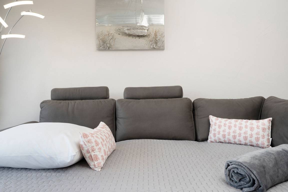 Wohnzimmer: Schlafsofa (110x210 cm), Kleiderschrank, Verdunkelung (Plissees), Platz für Kinderreisebett vorhanden
