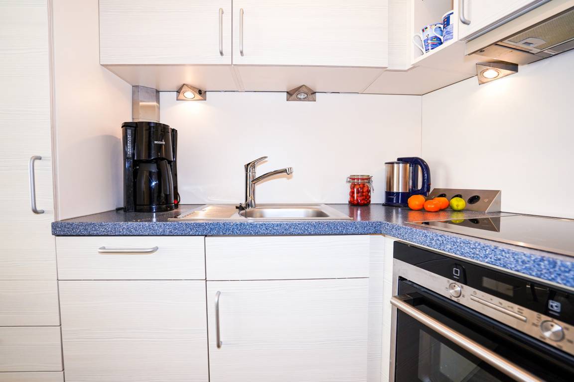 Die halb offen gestaltete neue Küche bietet Ihnen alles, was Sie in Ihrem Urlaub brauchen. Es stehen Ihnen ein Kühlschrank mit Gefrierfach, Backofen mit Mikrowelle, Spülmaschine und weitere kleine Küchenhelfer wie Kaffeemaschine, Wasserkocher und Toaster zur Verfügung.
