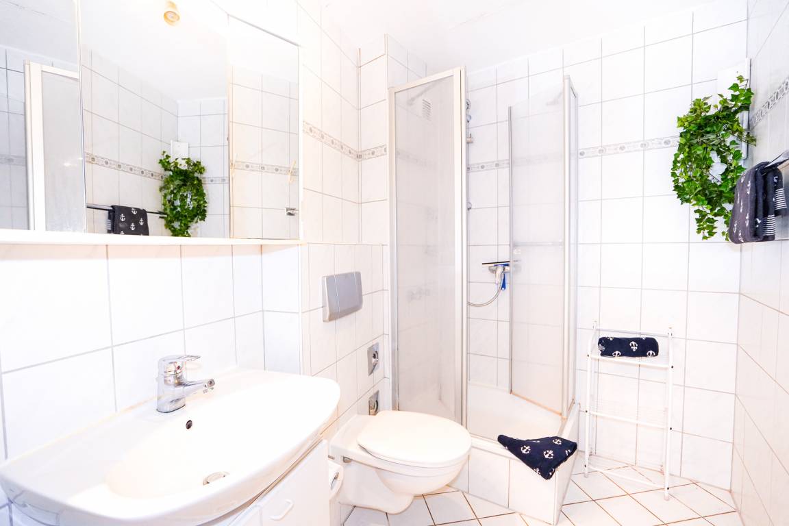 Das helle Badezimmer bietet Ihnen eine Dusche, WC und Waschbecken.