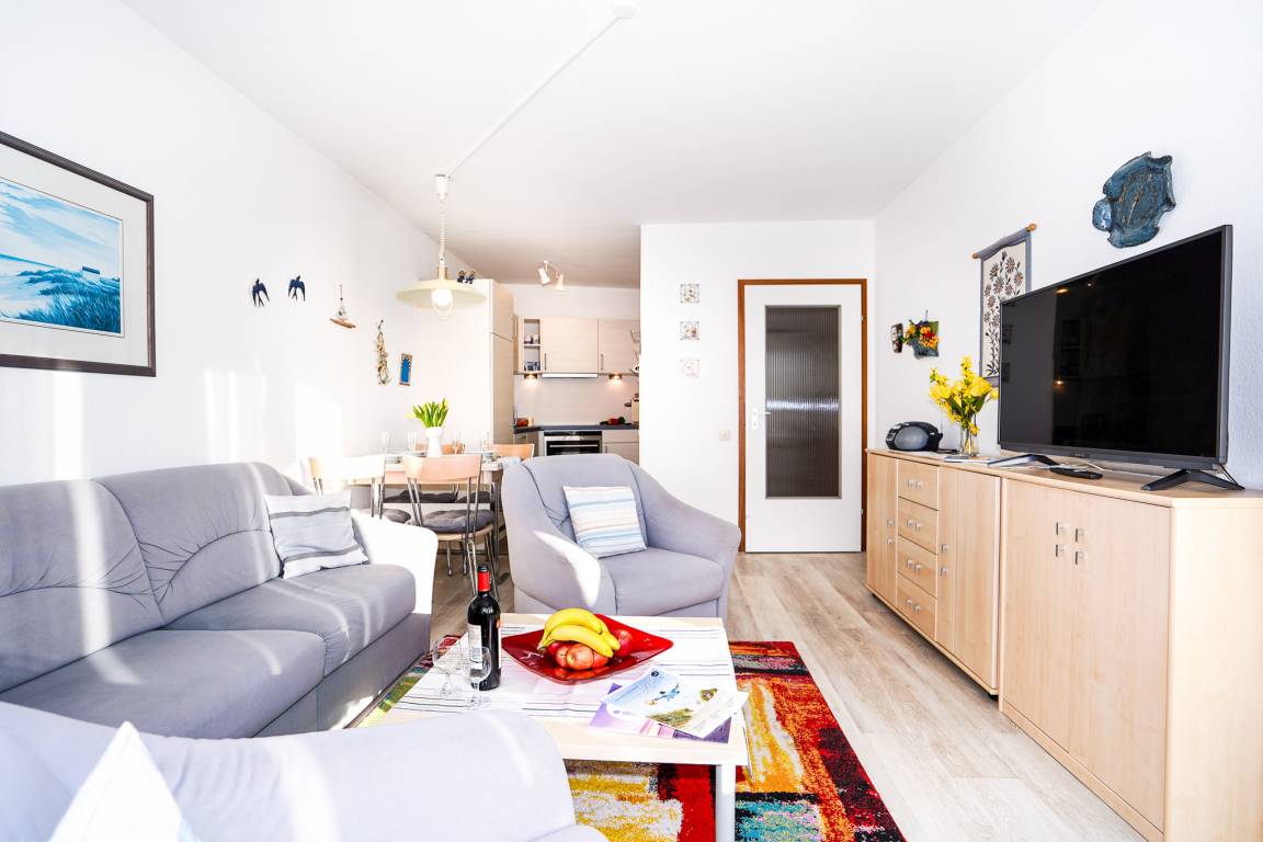 Das in freundlichen und hellen Farben eingerichtete Wohnzimmer bietet Ihnen eine große Schlafcouch, zwei Sessel, einen Esstisch und einen großen Fernseher, der zu entspannten Abenden einlädt. Erholen Sie sich nach einem aufregenden Urlaubstag auf dem gemütlichen Balkon.