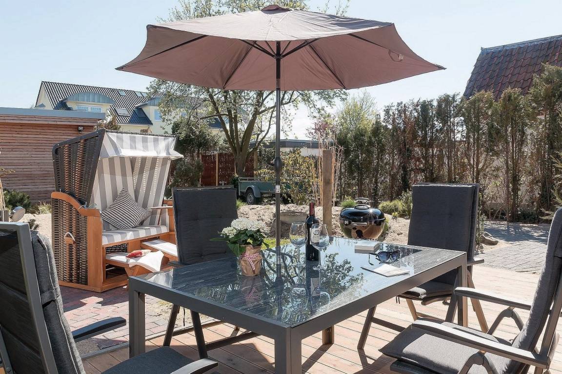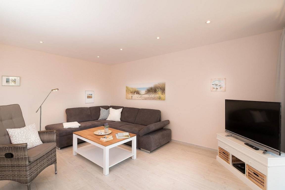 Über die Terrasse kommen Sie in Ihr Urlaubs-Quartier. Der große Wohnraum mit komfortabler Küche, Esstisch und Stühlen lädt direkt zum Wohlfühlen ein. Das modische Ecksofa hat eine Ottomane ist ausziehbar (Bettfunktion). Von hier aus genießen Sie ganz bequem den Blick in den Garten mit Strandkorb oder zum Fernseher.